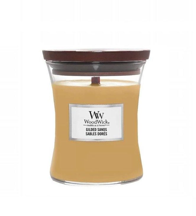 WOODWICK Candle в ароматі Gilded Sands – це свічка з ароматом пряного та солодкого пустельного повітря, інжиру та гваякового дерева. Об’єм свічки – 275 g. Ноти аромату: Верхня: бергамот, інжир, перець Середня: пустельне повітря, ветивер, жасмин В основі: гваякове дерево, амбра, елемі Характеристики свічки: Дерев’яний запатентований гніт Скляний свічник Кришка для правильного гасіння Зроблено в США Ароматична свічка WoodWick дарує мультисенсорні відчуття. Завдяки натуральному дерев’яному гноту створюється заспокійливий звук каміна, а оселя наповнюється ароматом та затишком.