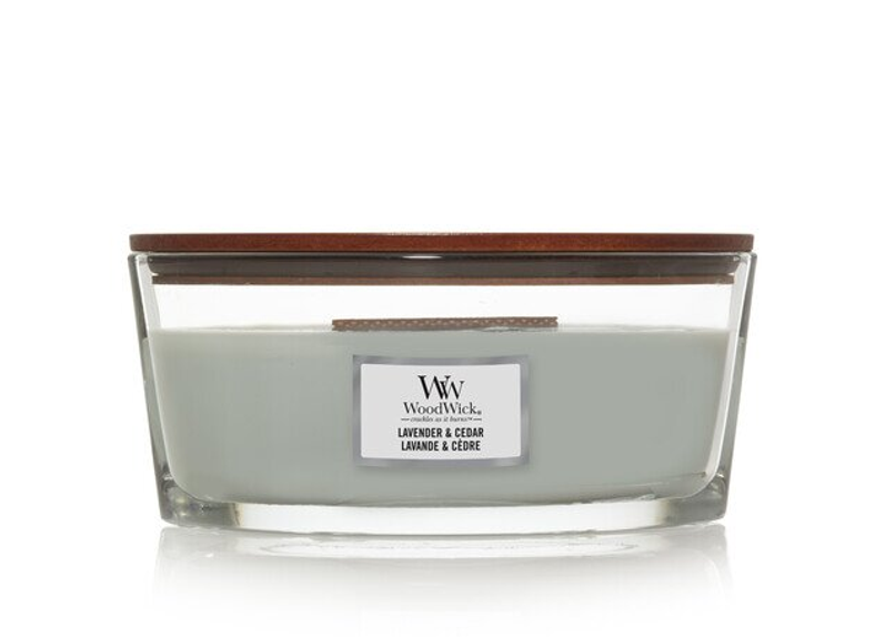 WOODWICK Candle в ароматі Lavender & Cedar – це свічка з збалансованим ароматом кипариса, лимонної цедри, ялинкової голки та лаванди. Об’єм свічки – 453 g. Ноти аромату: Верхня: листова зелень, рожевий перець, цедра лимона. Середня: лаванда, кипарис, квітка шавлії, ялинова голка. В основі: пачулі, бурштин, дерево. Характеристики свічки: Дерев’яний запатентований гніт Скляний свічник Кришка для правильного гасіння Зроблено в США Ароматична свічка WoodWick дарує мультисенсорні відчуття. Завдяки натуральному дерев’яному гноту створюється заспокійливий звук каміна, а оселя наповнюється ароматом та затишком.
