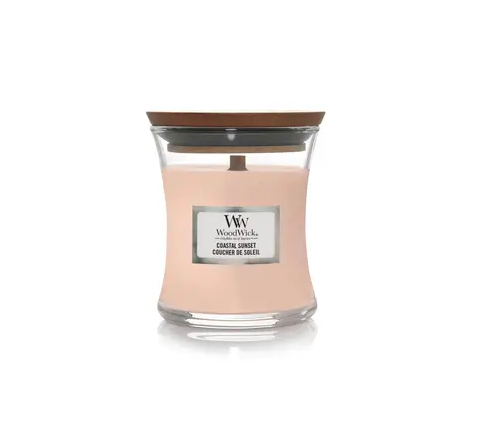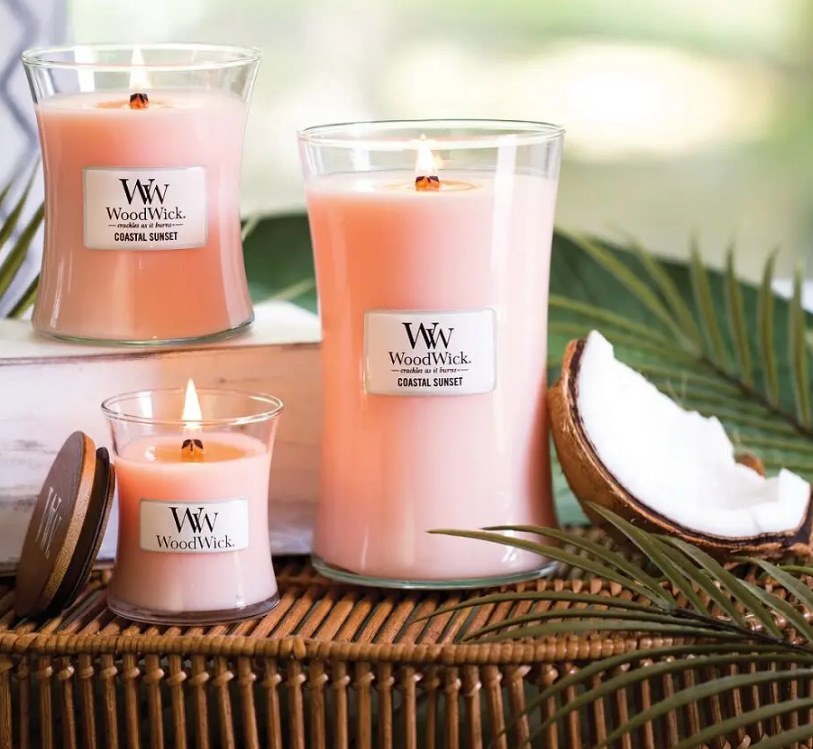 WOODWICK Candle в ароматі Coastal Sunset – це свічка з ароматом поцілованих сонцем квітів, кокосових нот і солоного океанського повітря.