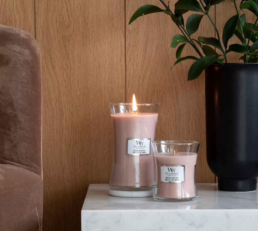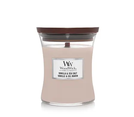 WOODWICK Candle в ароматі Vanilla Sea Salt – це свічка з ароматом м’яких квітів ванілі, залитих нотами морської солі і жасмину.