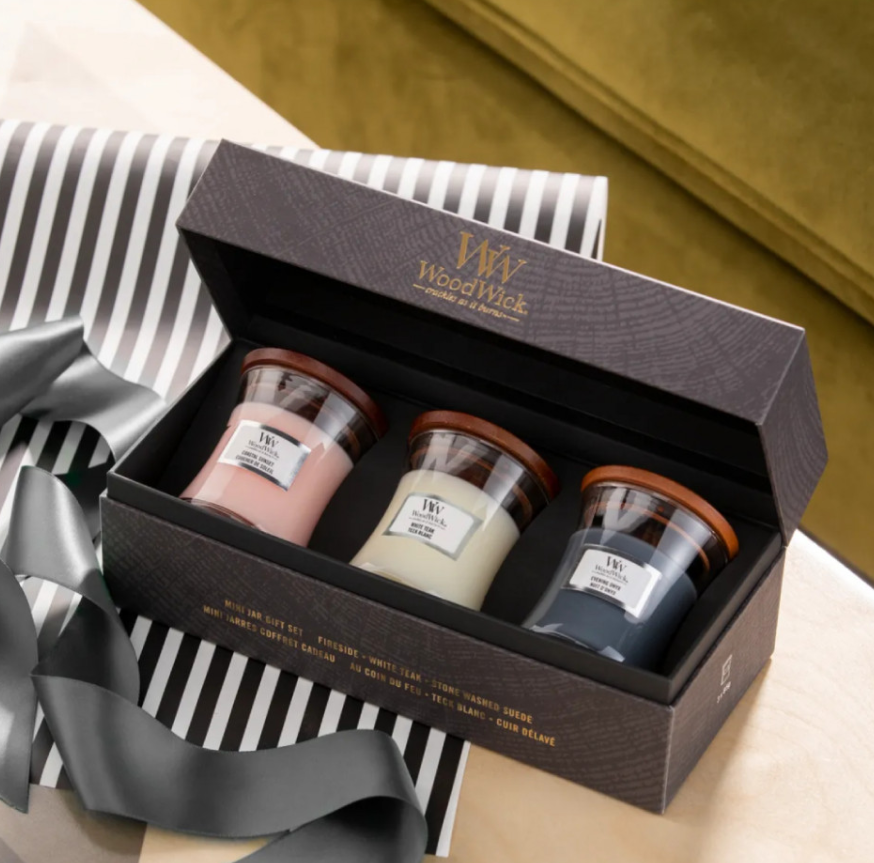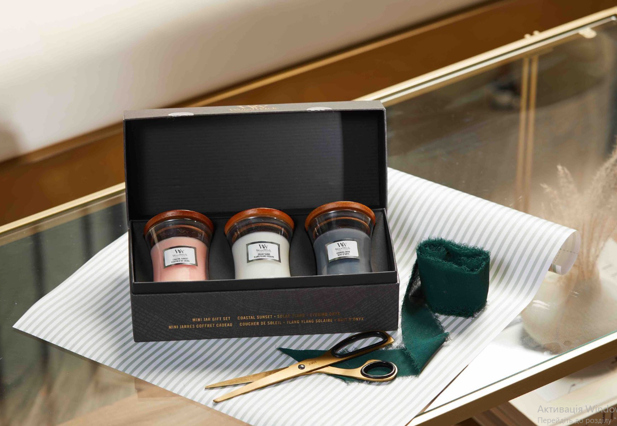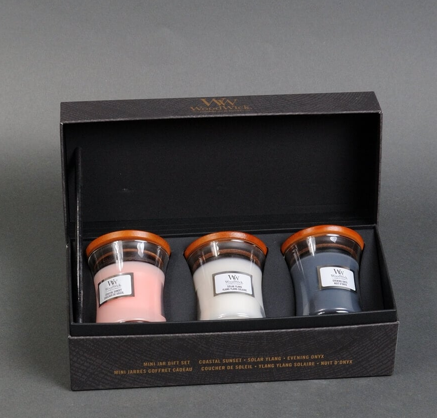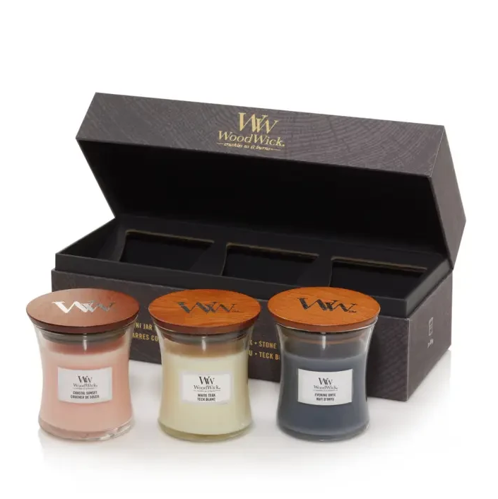 Набір cвічок Woodwick Mini включає три свічки в об’ємі по 85g різних ароматів: