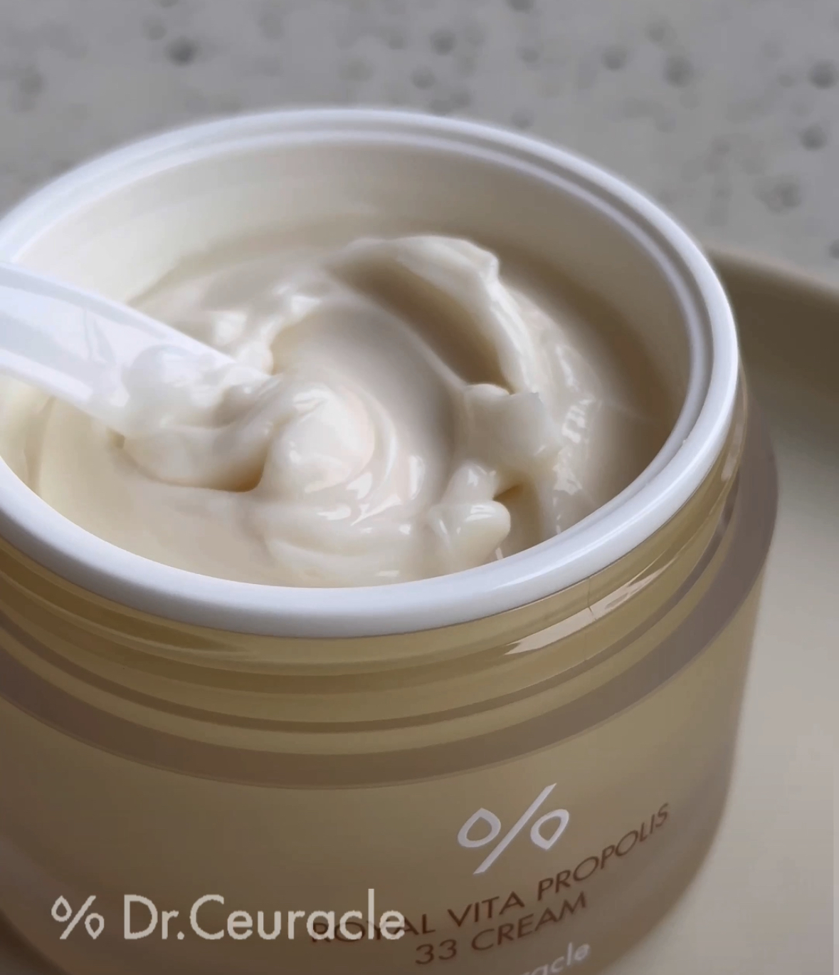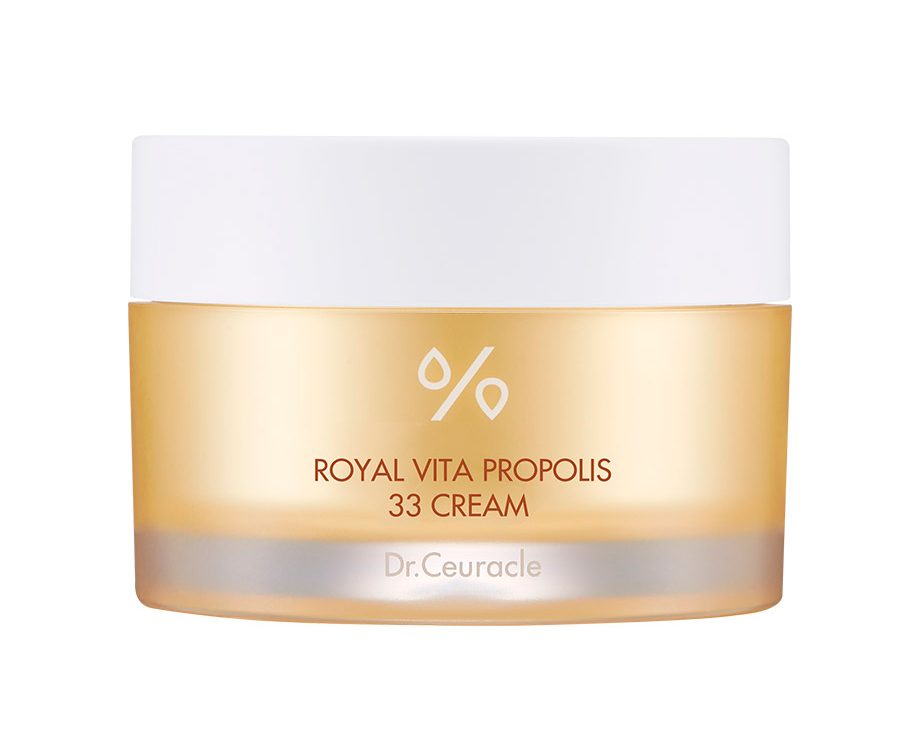 DR. CEURACLE royal vita propolis 33 cream – це насичений вітамінами та антиоксидантами крем для глибокого живлення та відновлення тонусу шкіри. Крем чудово оживляє втомлену шкіру, глибоко живить, пом’якшує, надає здоровий вигляд та природнє сяйво. Засіб має насичену кремову текстуру та ледь відчутний натуральний аромат, підходить для використання в денному та вечірньому догляді. До складу крему входить 33,5% екстракту прополісу та маточне молоко, які є природними багатозадачними інгредієнтами для підтримання краси шкіри. Завдяки унікальному набору вітамінів, мінералів, амінокислот та жирних кислот вони заспокоюють, живлять, а також борються з ознаками передчасного старіння, такими як в’ялість, втрата тонусу, тонкі заломи. Екстракт обліпихи, що є джерелом пальмітолеїнової кислоти (омега-7), яка в свою чергу входить до складу власних ліпідів шкіри, компенсує недостатню кількість жирних кислот в роговому шарі та допомагає зберегти шкіру пружною та підтягнутою. Найкраще підійде для сухої, нормальної, комбінованої шкіри, особливо для втомленої та вікової.