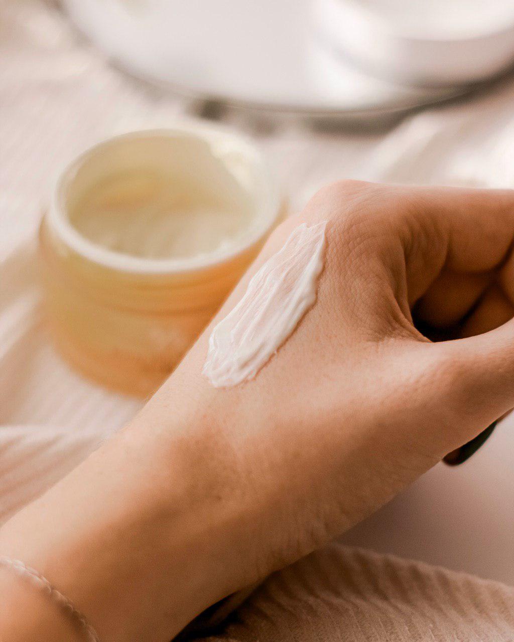 нанести крем легкими масажними рухами на очищену, тонізовану шкіру як завершальний етап у догляді.