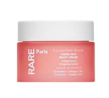Крем для обличчя RARE PARIS exception rosee night cream завдяки унікальній комбінації екстракту безсмертника, церамідів, Омега-3 та -6, відновлює шкіру, підсилює її природне сяйво та бореться з передчасним старінням. Засіб покращує мікроциркуляцію, стимулює вироблення колагену та зміцнює захисний бар’єр шкіри. Крем ефективно допомагає боротися з віковими змінами, залишаючи шкіру зволоженою та пружною. Засіб забезпечує тривале зволоження шкіри, активне живлення та відновлення упродовж ночі, надає природне сяяння без надмірного блиску. Після використання шкіра виглядає свіжою та доглянутою. Активні компоненти: • Цераміди – відновлюють гідроліпідний баланс шкіри, насичують клітини вологою, усувають сухість та лущення. Також у складі є холостерол та фосфоліпіди. • Омега 3 та 6 – жирні кислоти, які необхідні для збереження здорової бар'єрної функції шкіри. Загальмовують процеси старіння шкіри, усувають сухість та тьмяність дерми, зберігають колаген. • Екстракт Безсмертника - має регенеруючі властивості, надає шкірі здорового та сяючого вигляду. • Олія Авокадо – живить та пом’якшує шкіру. • Вітамін Е – антиоксидантний ефект та антивікова дія.