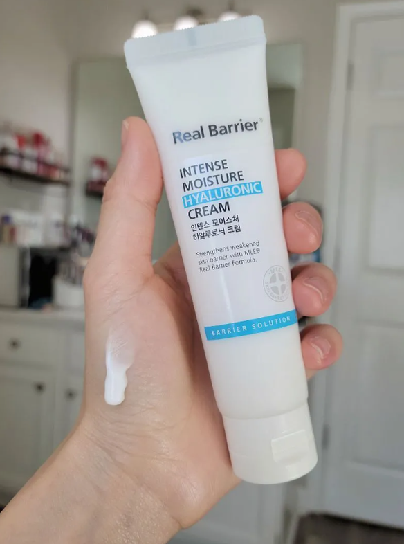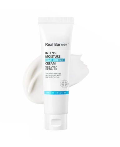 Ламелярний зволожуючий крем Real Barrier Intense Moisture Hyaluronic Cream заповнює нестачу вологи в клітинах епідермісу, формує захисний бар’єр, що знижує чутливість шкіри і підтримує зволоження на оптимальному рівні. Має пролонговану зволожуючу дію, у найкоротші терміни допомагає позбутися сухості та зневоднення. Косметика, створена на основі особливої ламелярної технології Multi Lamellar Emulsion (MLE®), працює як «латка». Ефективно вбудовується в ліпідний шар, відновлює цілісність та захист епідермісу. Відмінно зміцнює захисні функції та знижує вираженість судинних зірочок. Крем інтенсивно зволожує протягом 48 годин, відновлює бар'єрні функції шкіри, зменшує чутливість шкіри, заспокоює подразнення та почервоніння, прискорює процеси загоєння, затримує вологу в шкірі та запобігає її зневодненню, усуває сухість і зневоднення, вирівнює тон та покращує колір обличчя, чинить антиоксидантну дію. Крем підходить для нормальної, сухої та комбінованої шкіри. Має має легку текстуру, швидко поглинається і не залишає липкості. Активні компоненти: * MLE – Multi-Lamellar Emulsion – в основі формули запатентована інноваційна розробка багатошарова мультилямелярна емульсія (MLE – Multi-Lamellar Emulsion), яка за структурним та хімічним складом нагадує міжклітинні ліпіди, за рахунок чого може легко вбудовуватися у пошкоджені шари природи. Швидко відновлює бар'єрну та захисну функцію шкіри, сприяє затриманню вологи в шкірі та запобіганню її випаровуванню з поверхневих шарів. * Комплекс 7-ми видів гіалуронової кислоти – забезпечує глибоке зволоження шкіри на всіх шарах дерми. * Олія сафлору - ефективно живить та пом’якшує шкіру, чинить антиоксидантну дію, допомагає у боротьбі з першими ознаками старіння та куперозом. * Ектоїн – органічна амінокислота, ефективно захищає від впливу зовнішніх факторів і УФ-променів. * Мадекасосид – похідне з центелли азіатської, надає потужну протизапальну та заспокійливу дію, стимулює синтез колагену, надає антиоксидантний ефект, захищаючи клітини шкіри від окисного стресу. * Пантенол – має зволожуючу дію, зменшує роздратування та почервоніння. * Цераміди - підвищують захисні функції, запобігають втраті вологи та допомагають відновити шкіру. Позбавляють сухості, лущення, корисні в лікуванні алергічних висипань, екзем, псоріазу