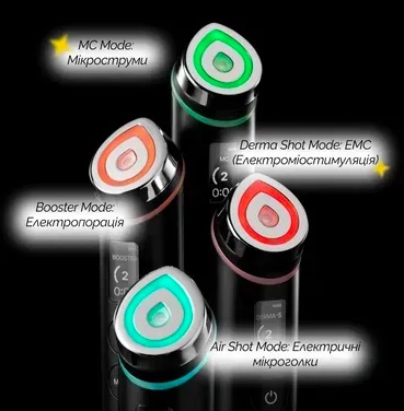 - Air Shot Mode: електричні мікроголки – створюють мікроскопічні проходи в шкірі, не пошкоджуючи її, покращують загальний вигляд пор. Активізують регенерацію клітин і стимулюють вироблення колагену. Частота використання: 2-3 рази на тиждень.