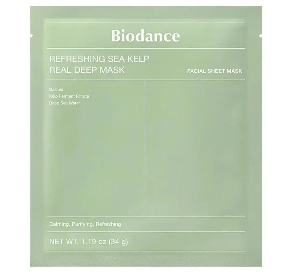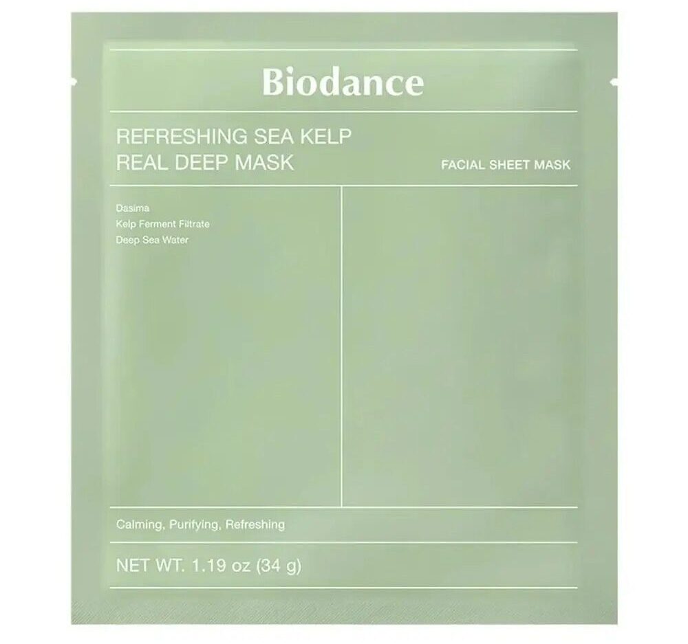 Маска гідрогелева BIODANCE real deep mask (green (refreshing sea kelp) з морськими водоростями, пробіотиками та пантенолом допомагає відновити гідро-ліпідний баланс шкіри та має заспокійливий ефект. Формула містить глибоководну морську воду, багату мінералами, яка контролює надлишок себуму та активізує заспокійливий ефект. Пробіотики (10%) допомогають зміцнити захисний бар’єр, зменшують запальні процеси і сприяють виробленню керамідів. Екстракт листя дерева німа знімає подразнення та має потужний антибактеріальний ефект. Маска особливо підійде для себопрофіцитної та схильної до висипань шкіри.