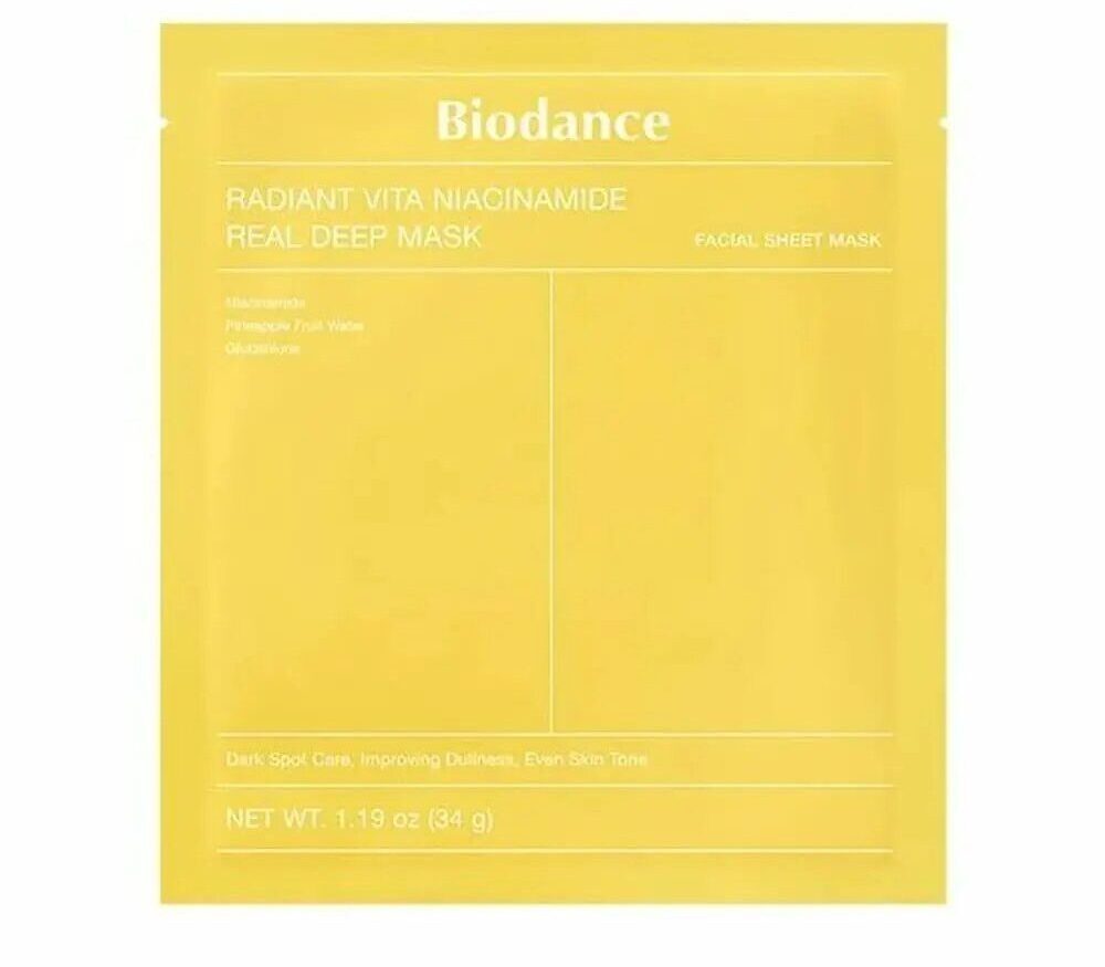 Гідрогелева маска BIODANCE real deep mask (radiant vita niacimamide) складається з нетоксичних інгредієнтів, які не викликають подразнення і є безпечною для чутливої шкіри. Маска забезпечує глибоке зволоження та освітлюючий ефект. На рівний тон та освітлення пігментації діють ніацинамід (2%) та глутатіон. 10% ананасової води, завдяки ензимам, відлущують ороговілі клітинки шкіри та усуває тіьмяність. Олія обліпихи зменшує купероз, знімає подразнення та почервоніння, позбавляє від лущень та покращує мікроциркуляцію, зменшує прояви пігментації. 8 типів гіалуронової кислоти сприяють кращому зволоженню шкіри.
