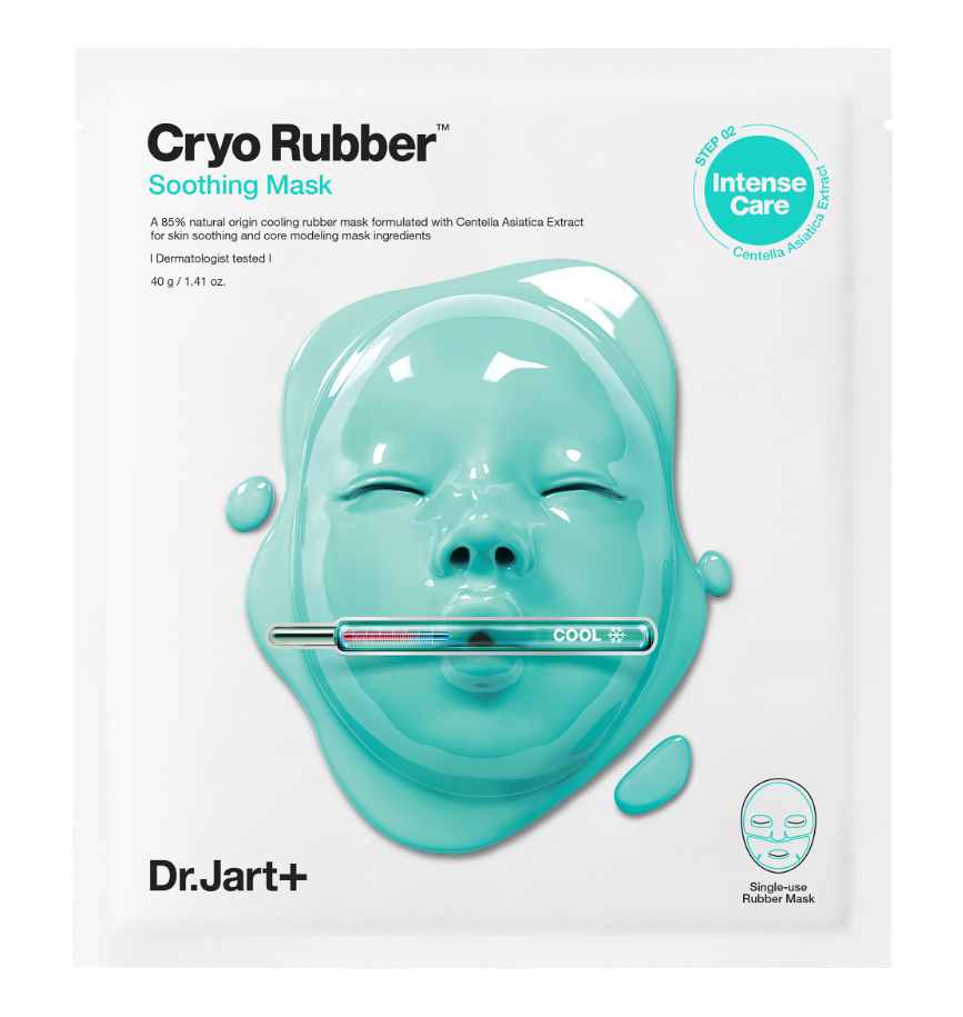 DR.JART+ Cryo Rubber Soothing Mask – альгінатна масочка, яка швидко приведе шкіру в порядок, додасть зволоження та гладкості. Особливістю маски є те, що вона охолоджує шкіру до ідеальної температури, миттєво освіжає і знімає припухлість. І перед цим її не потрібно тримати в холодильнику, що значно економить час. Основними компонентами є алантоїн та екстракт центелли, які моментально заспокоюють шкіру, знімають подразнення, запалення та почервоніння. Альгінатна маска для обличчя створена для заспокійливої та регенеруючої дії із миттєвим охолоджуючим ефектом. Активними компонентами є алантоїн, ніацинамід, екстракт азіатської центелли, комплекс морських водоростей, екстракт німа. Такий склад заспокоює роздратовану шкіру, усуває почервоніння, лікує запалення та сприяє регенерації, володіє антисептичним ефектом. Маска моделює овал обличчя, підвищує еластичність шкіри, перешкоджає зневоднення і появу сухості, нормалізує роботу сальних залоз, видаляє надлишки шкірного себуму, бореться із висипаннями, має протизапальні, регенеруючі властивості. Комплекс включає в собі висококонцентровану сироватку та готову альгінатну маску. Найкраще підходить для чутливої, проблемної шкіри.