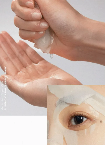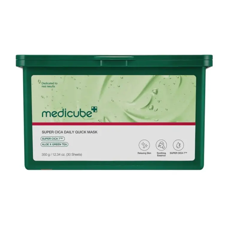Medicube Super Cica Daily Quick Mask – це набір з тридцяти заспокійливих масок з центелою, алое та зеленим чаєм. Швидка і зручна щоденна 60-секундна маска, що миттєво заспокоює, охолоджує та зволожує чутливу, реактивну або пошкоджену шкіру. Підходить як для ранкової підготовки перед виходом на вулицю, так і для вечірнього відновлення після денного стресу. Ідеальна у ті дні, коли шкіра виглядає втомленою, сухою, має почервоніння та лущення. Можна використовувати перед нанесенням макіяжу або перед сном, щоб повернути обличчю відчуття комфорту, зменшити подразнення або просто дати шкірі хвилину відпочинку. Тоненькі целюлозні листи щедро просочені есенцією з додаванням заспокійливих рослинних екстрактів – центели, алое, зеленого чаю та чайного дерева. Вони зменшують почервоніння, дають приємне відчуття прохолоди, шкіра стає більш рівною, сяючою та заспокоєною. За результатами клінічних досліджень через 60 секунд після використання маски температура шкіри знижується на 7.22 °C, а бар’єрна функція підвищується на 41.27%. В основі формули – фірмовий комплекс Super Cica 7™ з концентрованим поєднанням семи активних компонентів центели азіатської: екстракти листя, кореня, стебла, а також чисті молекули мадекасосиду, азіатикозиду, азіаткової та мадекасової кислот. Разом вони забезпечують потужний заспокійливий, протизапальний та відновлювальний ефект. Цей багатофункціональний комплекс зменшує подразнення, прискорює загоєння, зміцнює захисний бар’єр шкіри, підвищуючи її стійкість до зовнішніх подразників. Активні інгредієнти: комплекс Super Cica 7™ – запатентована композиція з 7 компонентів центели азіатської (екстракт, листя, корінь, мадекасосид, азіатикозид, азіатикова та мадекассова кислоти), зменшує подразнення та почервоніння, зміцнює шкірний бар’єр; екстракт алое – має охолоджувальну та зволожувальну дію, усуває відчуття стягнутості та дискомфорту, пом’якшує і заспокоює подразнену шкіру; екстракт зеленого чаю – джерело поліфенолів і антиоксидантів, які нейтралізують вільні радикали, зменшує запалення, попереджає оксидативний стрес і підтримує свіжий, рівний тон шкіри; екстракт чайного дерева – володіє протизапальними та заспокійливими властивостями, пригнічує розвиток патогенної мікрофлори, контролює активність сальних залоз, усуває свербіж; екстракт півонії – пригнічує медіатори запалення в шкірі, зменшує набряки та подразнення, покращує загальний тонус шкіри, вирівнює колір обличчя; екстракт альбатрелуса – знижує чутливість та підвищує толерантність до зовнішніх подразників, включно з температурними стресами та забрудненням; комплекс з 8 видів гіалуронової кислоти – утримує вологу як на поверхні, так і в глибших шарах епідермісу, створює ефект наповненої, пружної шкіри.