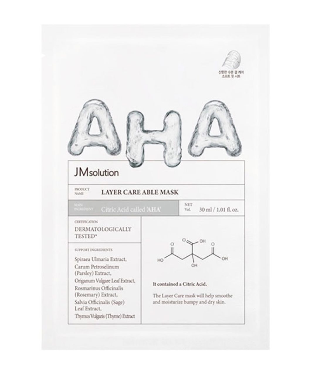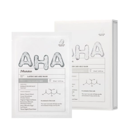 JM SOLUTION layer care able aha – це тканева маска з AHA кислотою та 6 рослинними екстрактами для покращення мікрорельєфу шкіри. Маска залишає приємне відчуття гладкості та повертає шкірі здорове сяяння. AHA-кислота тут представлена лимонною кислотою, вона працює на відлущення та очищення пір, надає легкий освітлюючий ефект. В складі також є морська вода, яка містить йод і активізує процеси регенерації клітин, позбавляє шкіру від висипань. Екстракти чебрецю, шавлії, розмарину, в’язу, петрушки мають загоюючі властивості і здатність відновлювати пошкоджену шкіру, залишають значний освіжаючий та тонізуючий ефект. Трегалоза забезпечує ефективне зволоження, пом’якшує шкіру, уповільнює накопичення ліпофусцина (пігменту старіння) в шкірі. Надає детокс ефект та активізує клітинну аутофагію. Маска JM SOLUTION layer care (able aha) підходить для всіх типів шкіри, окрім дуже чутливої.