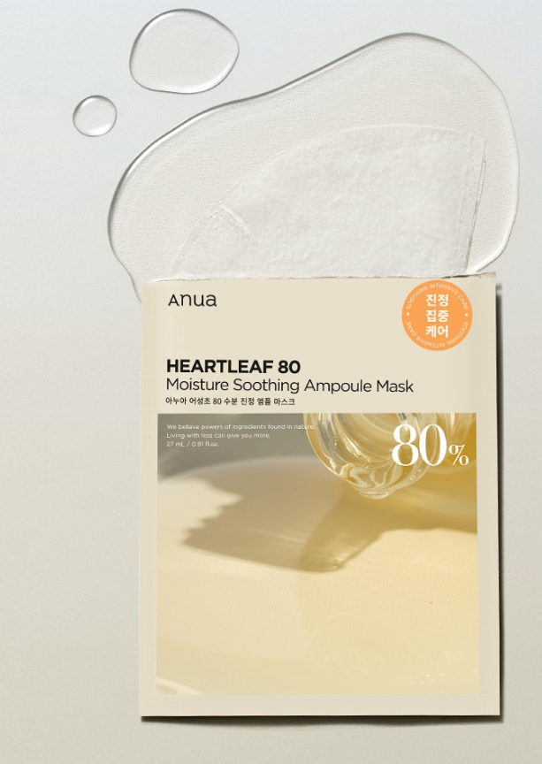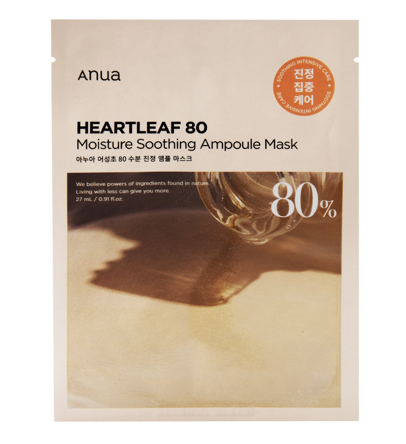 Тканинна маска ANUA heartleaf soothing ampoule mask (moisture) з легкою гелевою текстурою для зволоження та заспокоєння всіх типів шкіри. Екстракт хауттюнії (80%) знижує чутливість, усуває свербіж та почервоніння. Екстракт какао покращує здатність клітин шкіри до регенерації. Пантенол зменшує запальні процеси та забезпечує довготривале зволоження в поєднанні з гіалуроновою кислотою. Маска підходить для всіх типів шкіри.