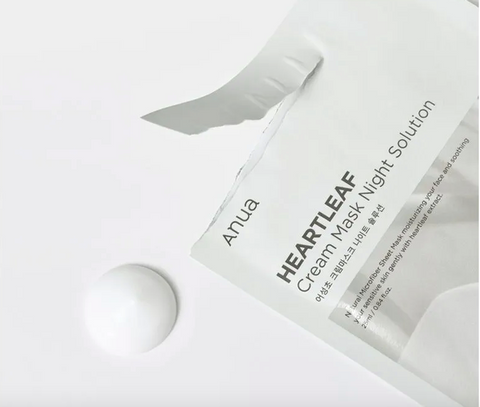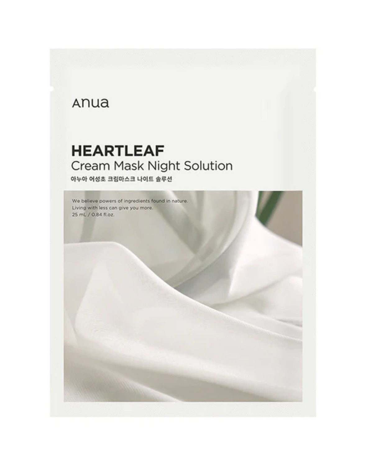 ANUA heartleaf soothing ampoule mask (night solution) – це зміцнююча нічна тканинна маска з кремовою есенцією, що створена для подразненої шкіри в стані зневоднення або для шкіри з пошкодженим захисним бар’єром. Завдяки формулі, збагаченій пантенолом, церамідами та маслом ши маска відновлює гідроліпідний бар’єр та повертає шкірі здоровий вигляд. Фітосфінгозин має заспокійливу дію на шкіру, допомагаючи зменшити почервоніння та чутливість. Екстракт хауттюнії (0,1%) позитивно впливає на чутливу шкіру та усуває подразнення та свербіж. Маска підходить для всіх типів шкіри.