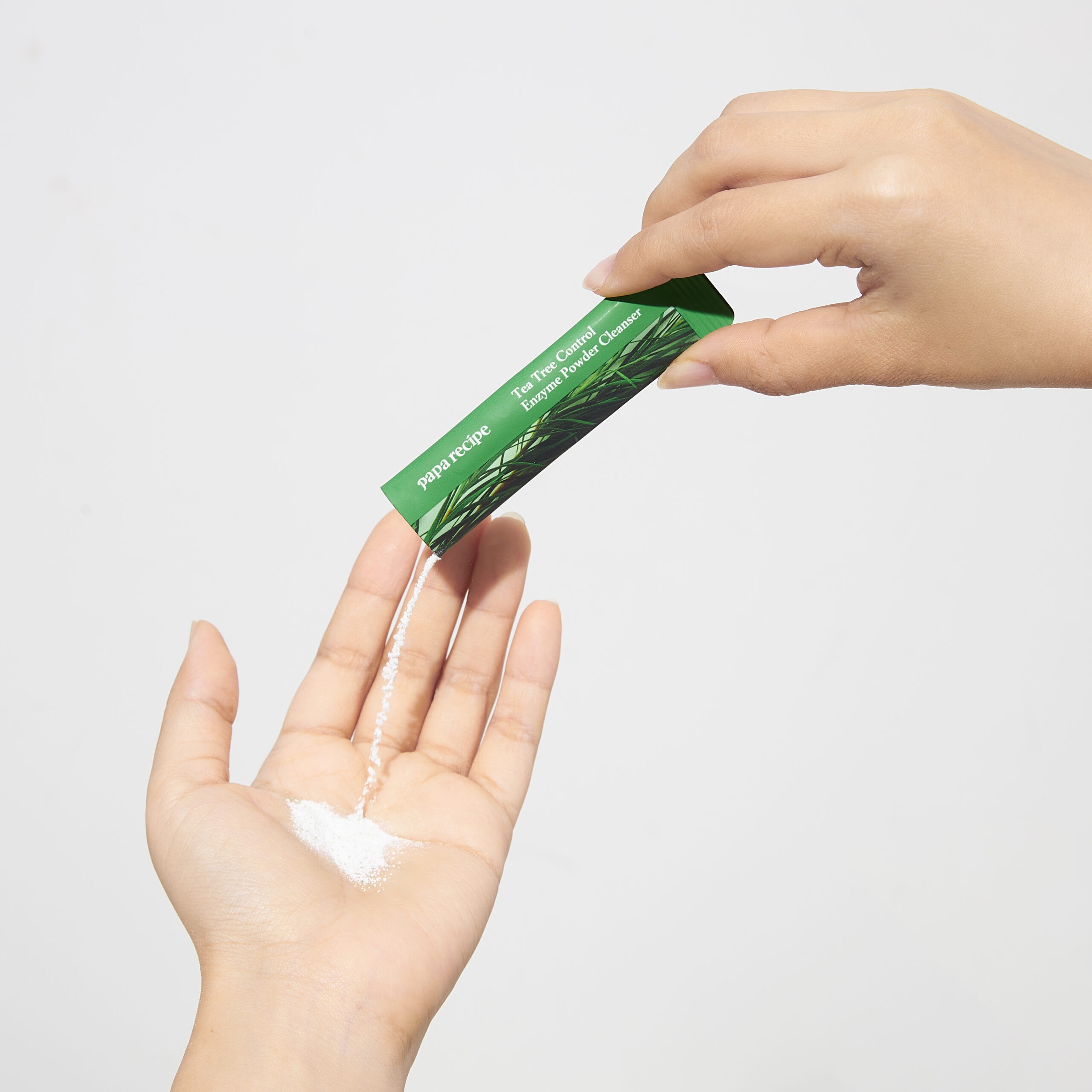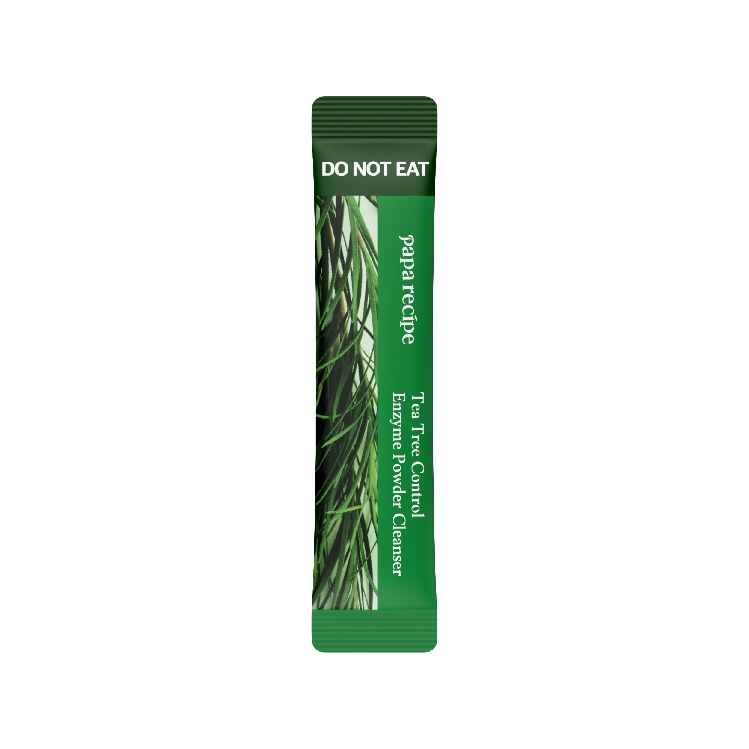 Papa Recipe Tea Tree Control Powder Cleanser — ензимна пудра, яка забезпечує м’яке очищення та відлущення шкіри без подразнення та сухості. Також допомагає регулювати роботу сальних залоз, візуально зменшувати пори, запобігати появі висипань та заспокоювати подразнення. Має дружній до шкіри pH 5,5±1. Ензимна пудра підійде для будь-якого типу шкіриособливо рекомендується власницям себопрофіцитної шкіри. Після умивання залишає шкіру очищеною та свіжою. Має легкий аромат чайного дерева. Основні компоненти: Папаїн, PHA (лактобіонова кислота) та порошок зі шкарлупи волоського горіха — сприяють м’якому видаленню ороговілих клітин для підтримки нормального циклу оновлення шкіри. Зелені капсули містять екстракт листя чайного дерева і запатентовані компоненти (екстракти лісової суниці та цибулі) — допомагають зняти подразнення та зупинити розвиток запалення. Ментол — охолоджує та освіжає шкіру, а також допомагає контролювати її жирність. Фермент лактобактерій — сприяє знищенню шкідливих для шкіри бактерій та створює здорову, збалансовану мікрофлору.