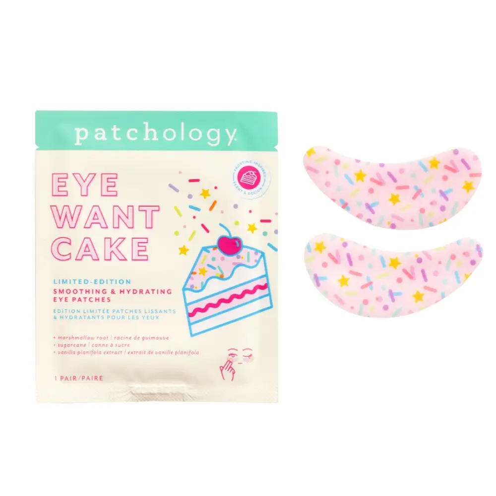 PATCHOLOGY Smoothing&Hydrating eye patches Want Cake - патчі з новою технологією no-slip забезпечують ідеальну фіксацію, інтенсивно зволожують і підтягують шкіру, допомагаючи зменшити дрібні зморшки. Патчі містять ефективні інгредієнти, що ідеально підходять для заспокоєння та тонізування "втомлених" очей. Завдяки зволожувальному гідрогелю всередині та тканинній оболонці, ці патчі не тільки дарують комфорт, а й дозволяють створити ефектний дизайн.