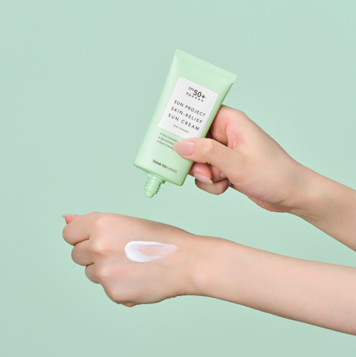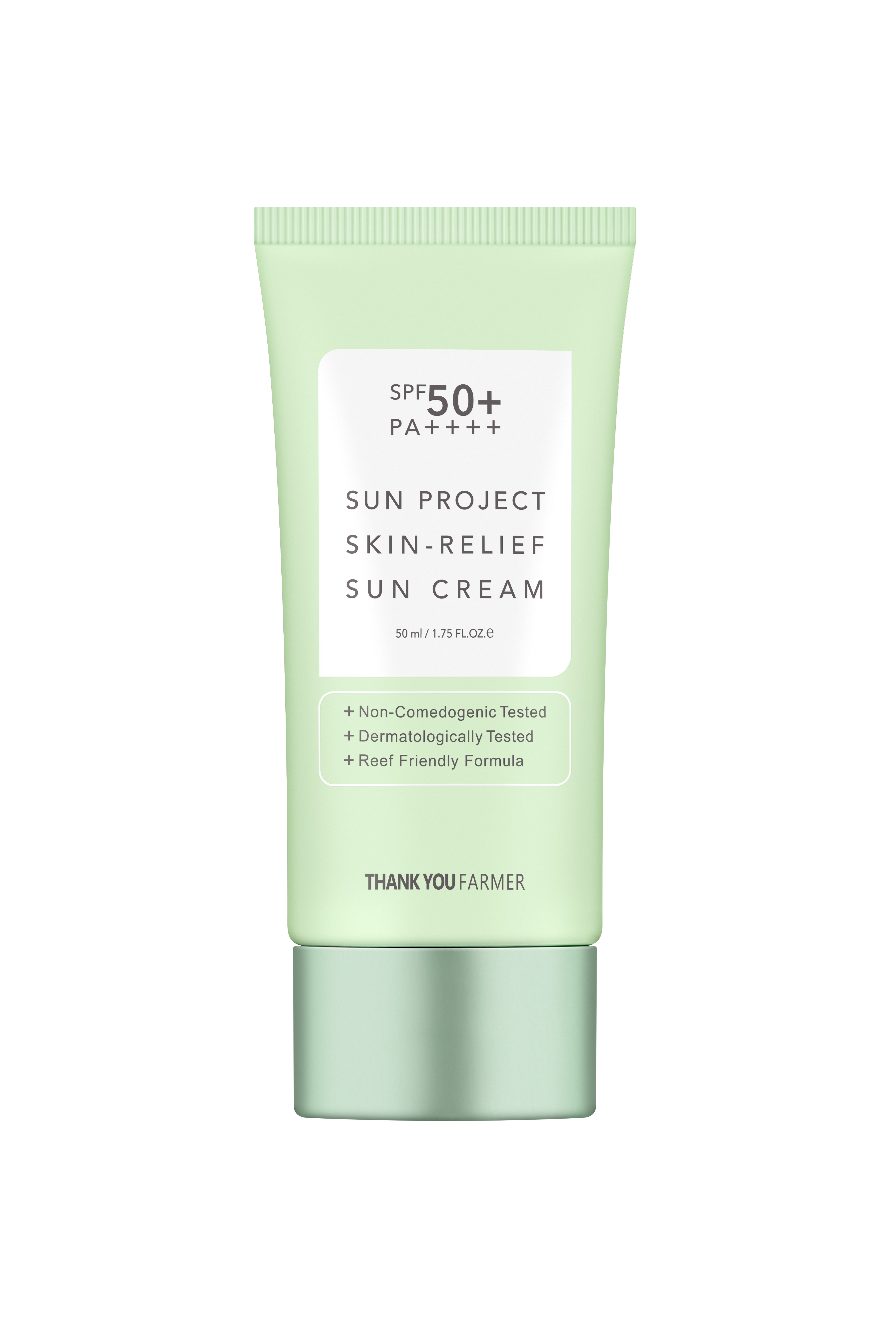 THANK YOU FARMER Sun Project Skin Relief Sun Cream SPF50+ PA++++ — освіжаючий протисонцевий крем, який створений для шкіри, що перевантажена зовнішніми подразниками. Чудово захищає шкіру від UV-променів завдяки хімічним фільтрам у складі. Містить комплекс компонентів рослинного походження для ефективного заспокоєння шкіри. Підходить для всіх типів шкіри, зокрема для чутливої та схильної до акне. Має шовковисту кремову текстуру, не містить ароматизаторів, швидко вбирається без жирної плівки та білого нальоту. Крем також пройшов дерматологічні випробування та є некомедогенним.