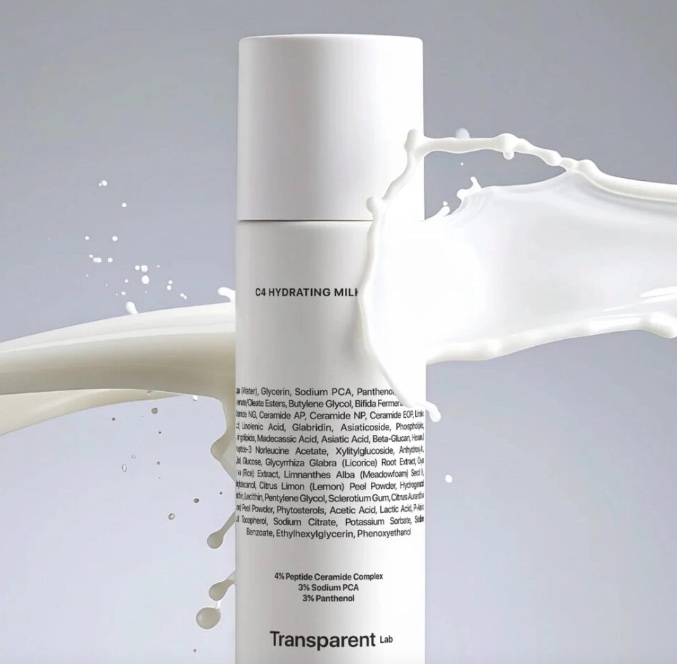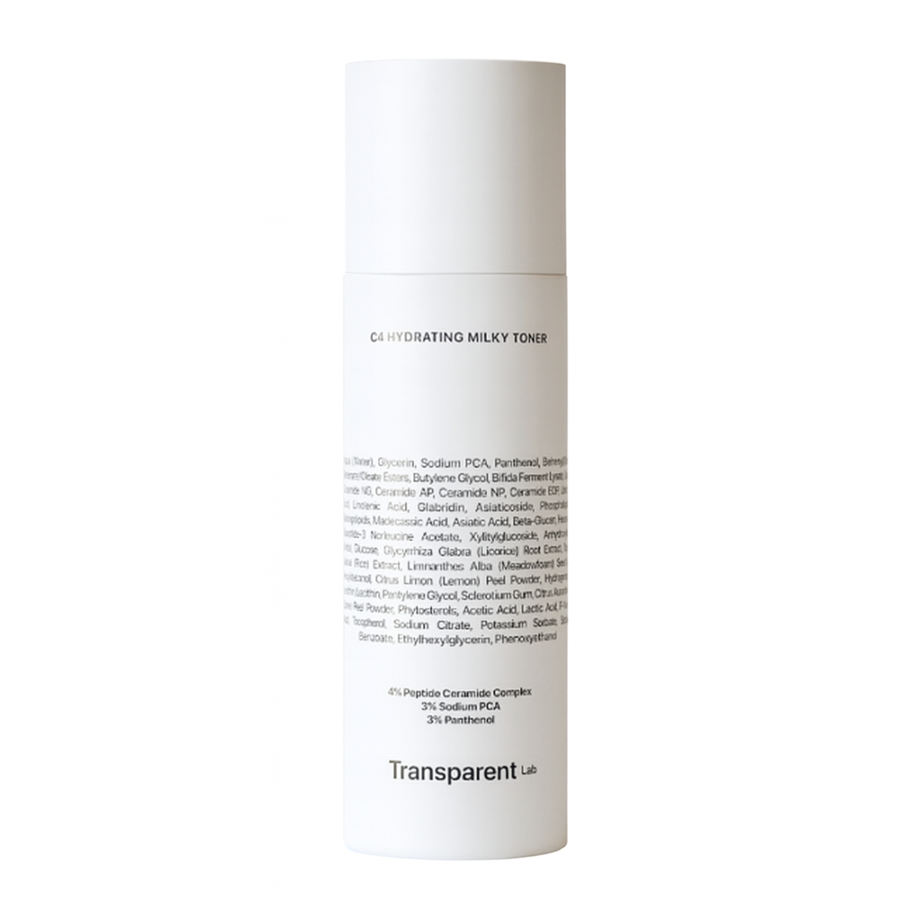 Зволожувальний тонер TRANSPARENT LAB C4 Hydrating Milk Toner із молочною текстурою, створений на основі зволожувальних, заспокійливих та живильних компонентів для відновлення та зміцнення захисного бар’єру шкіри.