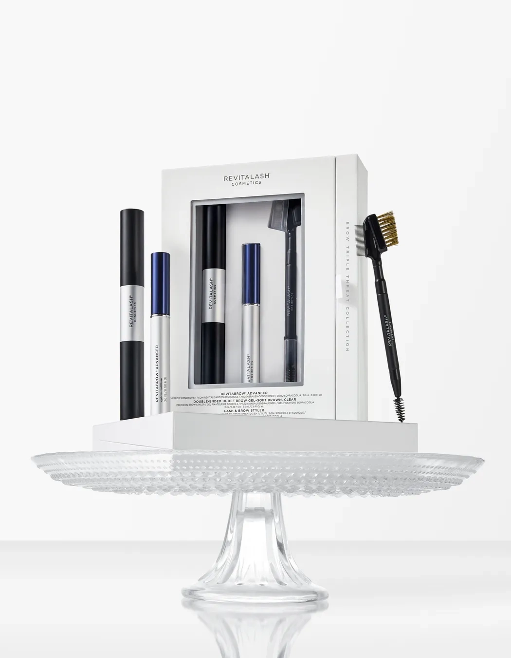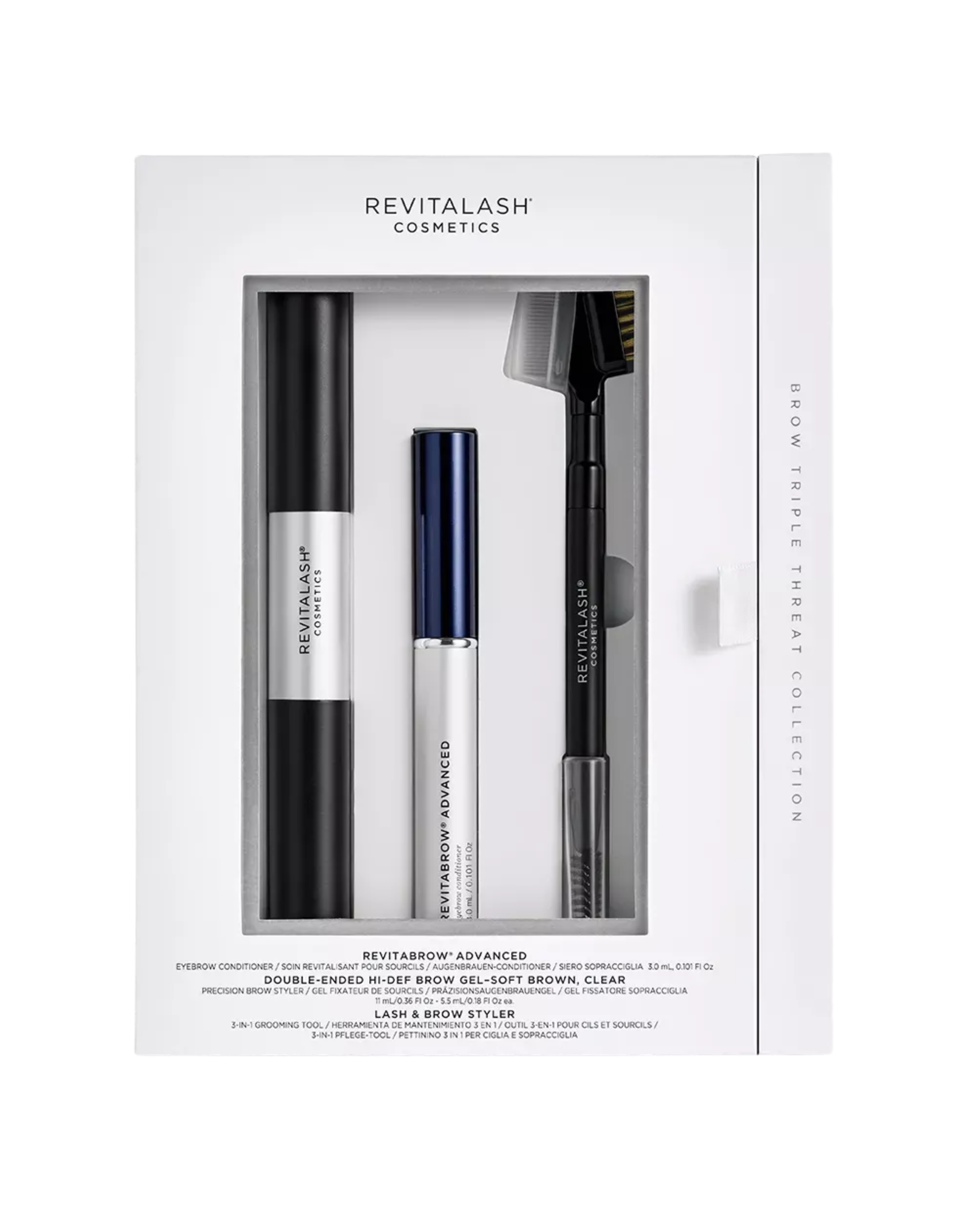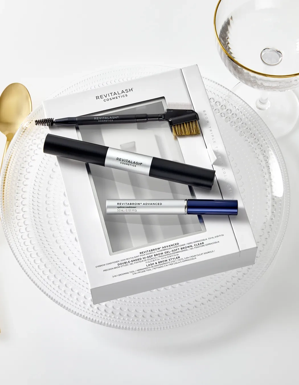 Набір для брів REVITALASH включає найкращі засоби для брів — повнорозмірну сироватку для брів RevitaBrow® Advanced, унікальний двосторонній гель для брів Hi-Def Brow Gel, а також новий стайлер для вій та брів.
