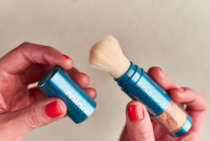 Сонцезахисна пудра для поновлення захисту від сонця SPF 50 /PA++++. Пудра має легке та природне покриття, натуральний фініш, водостійкість 80 хвилин. Пудра підходить для всіх типів шкіри. Виробником заявлено що пудра є гіпоалергенною та некомедогенною. Пензлик пудри покритий запатентованим лосьйоном, що складається з поверхнево-активних речовин і добре відомого нетоксичного консерванту, без парабенів, який перешкоджає зростанню бактерій та грибів, щоб зберегти свіжість. (Мити пензлик не рекомендується виробником). Захист від UV-випромінювання забезпечують фізичні фільтри: Titanium Dioxide (22.5%), Zinc Oxide (22.5%). Технологія EnviroScreen™ – запатентована розробка Colorescience®. Технологія EnviroScreen™ використовує запатентовані активні інгредієнти, оксид цинку та діоксид титану, які створюють бар’єр, що запобігає впливу вільних радикалів та окислювального стресу. Ці запатентовані активні інгредієнти у поєднанні зі спеціальними компонентами працюють у синергізмі для захисту шкіри від ушкоджень, викликані випромінюваннями UVA/UVB променів, забрудненнями, синім світлом (високоенергетичне випромінювання синьої частини видимого спектру або HEV) та інфрачервоним випромінюванням. Інші активні компоненти: Vitachelox® – це потужне тріо антиоксидантів, серед яких зелений чай, екстракт виноградних кісточок та екстракт деревини дуба, що сприяють захисту шкіри від вільних радикалів та забруднень. Комбінація таратаніну (потужного антиоксиданту) та органічних паростків соняшника захищає шкіру від передчасного старіння внаслідок впливу інфрачервоного випромінювання. Зволожуючі компоненти: Sodium Hyaluronate, Glycerin