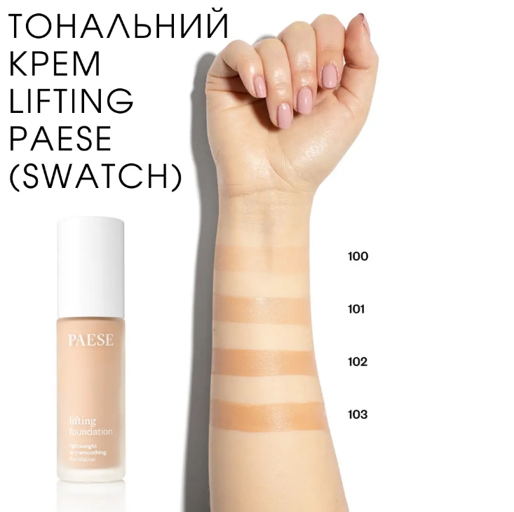Тональний крем Lifting Foundation Light and Smooth від Paese є зволожуючою тональною основою з ефектом ліфтингу. Засіб розроблений спеціально для сухої, тьмяної та втомленої шкіри. Засіб має легку консистенцією та натуральний фініш, приховує дрібні недоліки, надаючи шкірі свіжий та здоровий вигляд. Тональний крем Lifting Light and Smooth ідеально підходить для зрілої та тьмяної шкіри, забезпечуючи світловідбиваючий ефект та натуральний фініш. Багата формула крему збагачена активними інгредієнтами, які сприяють підвищенню пружності шкіри. У складі є ліфтингові полімери, які оптично розгладжують зморшки, роблячи риси обличчя м’якшими, а шкіру гладкішою. Крем також містить кремній та магній, які стимулюють синтез колагену, покращуючи стан шкіри. Серед активних інгредієнтів крему присутні Вітаміни А, С і Е, які мають антиоксидантні властивості та покращують колір шкіри. Д-пантенол зволожує шкіру та заспокоює подразнення, а Провітамін В5 зволожує, відновлює та заспокоює шкіру.