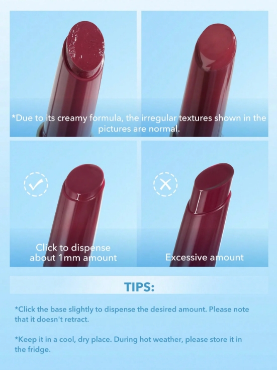 Нанесіть необхідну кількість помади на губи та рівномірно розподіліть. Наносити від центру до країв, щоб уникнути надмірно щільного шару у куточках. Для максимального ефекту нанесіть подвійний шар у центрі.