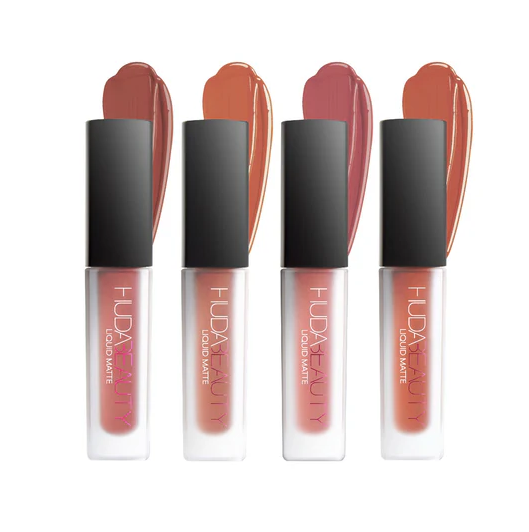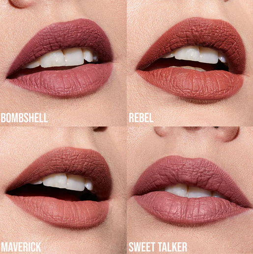Чотири рідкі матові помади від бренду HUDA BEAUTY у міні-об’ємі. Набір містить 2 легендарні відтінки – Bombshell та Sweet Talker і два нові: Maverick і Rebel. Помади дуже стійкі, до 8-ми годин носіння, містять доглядові компоненти, серед яких лікопін, оливкова олія, вітамін Е та незамінні жирні кислоти. З цією варіативністю відтінків можна створити велику кількість образів – від ніжного нюдового до грайливого гранжевого.