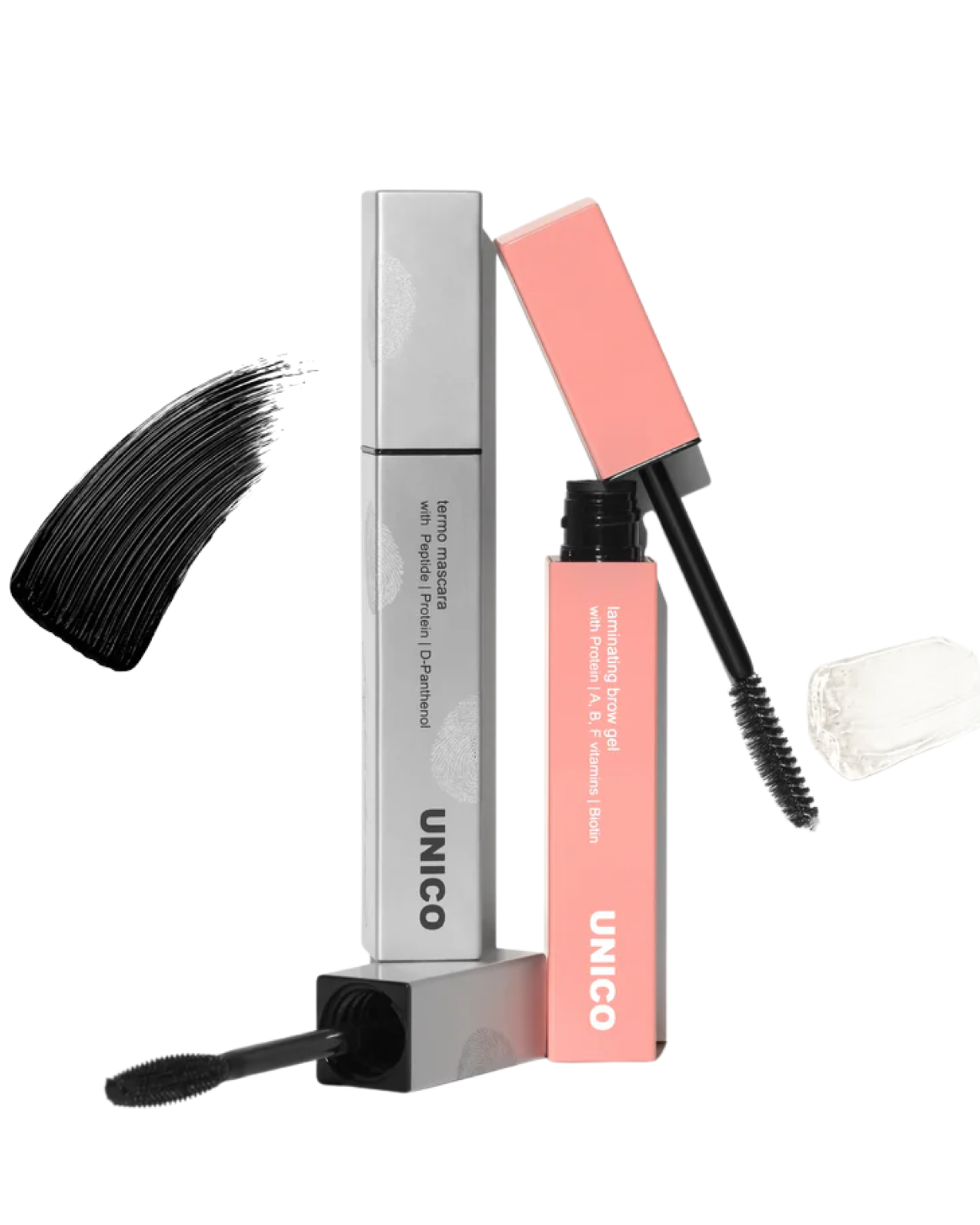 UNICO lash & brow makeup kit – це набір для макіяжу, що поєднує два маст-хеви щоденного макіяжу та підкреслює красу очей. Використовуй термотуш із пептидами для подовження вій без обтяження, а прозорий гель–скульптор — для моделювання та натуральної фіксації брів. У набір вхидить два засоби від бренду UNICO: 1.UNICO termo mascara with peptides – це термотуш — сироватка для вій, яка виконана за іноваційною технологією. Вона не лише фарбує, а й доглядає, роблячи вії еластичними та густими, не осипається та не розтікається, лишаючи темні кола під очима, але при цьому легко змивається теплою водою. Пептиди та рослинний протеїн у складі стимулюють ріст вій, пантенол відповідає за зволоження та зміцнення, а комплекс восків забезпечує текстуру та об’єм. Зручна силіконова щіточка з першого разу промальовує вії, видовжуючи їх та роблячи більш обʼємними, а її форма дозволяє легко промальовувати вії у кутиках, не лишаючи чорних слідів на обличчі. Маса — 10 грам Колір – насичений чорний. Активні компоненти: Пептиди — сприяють зміцненню вій, стимулюючи їх зростання. Рослинний протеїн — живить та захищає вії, роблячи їх більш здоровими та пружними. Пантенол (Провітамін B5) — заспокоює та зволожує вії, сприяє їх зміцненню та росту. Карнаубський Віск та Віск Бджолиний — додають текстуру та об’єм, допомагаючи формувати щільне покриття на віях. Використання: За допомогою щіточки, нанесіть засіб на вії. 2.UNICO sculpt & care вrow gel – це стійкий прозорий гель–скульптор, який дозволяє легко надати бровам бажану форму. Матова формула забезпечує бровам максимально натуральний вигляд. Біотин у складі зміцнює та стимулює ріст нових волосків, комплекс вітамінів А, B, E, F – підвищують еластичність, а рослинний протеїн надає щільності та наповнює структуру волосків. Засіб має інноваційну двосторонню щіточку з коротким і довгим ворсом. Короткий ворс дозволяє дозувати ідеальну кількість засобу, довгий — розчісує та укладає кожен волосок. Гель не залишає слідів і не створює ефекту жорсткості — лише ідеально вкладені брови без липкого блиску. Маса — 10 грам Доглядові компоненти засобу: Біотин — стимулює ріст нових волосків, зміцнює наявні, сприяє загальному оздоровленню брів. Гідролізований рослинний протеїн — проникає в структуру волосків, зміцнює зсередини, робить брови щільнішими та стійкішими до ламкості. Пантенол (провітамін В5) — заспокоює шкіру та запобігає її пересушенню, допомагає відновлювати волоски. Комплекс вітамін А, Е, F — антиоксиданти, які захищають волоски від впливу навколишнього середовища та сприяють їх еластичності.