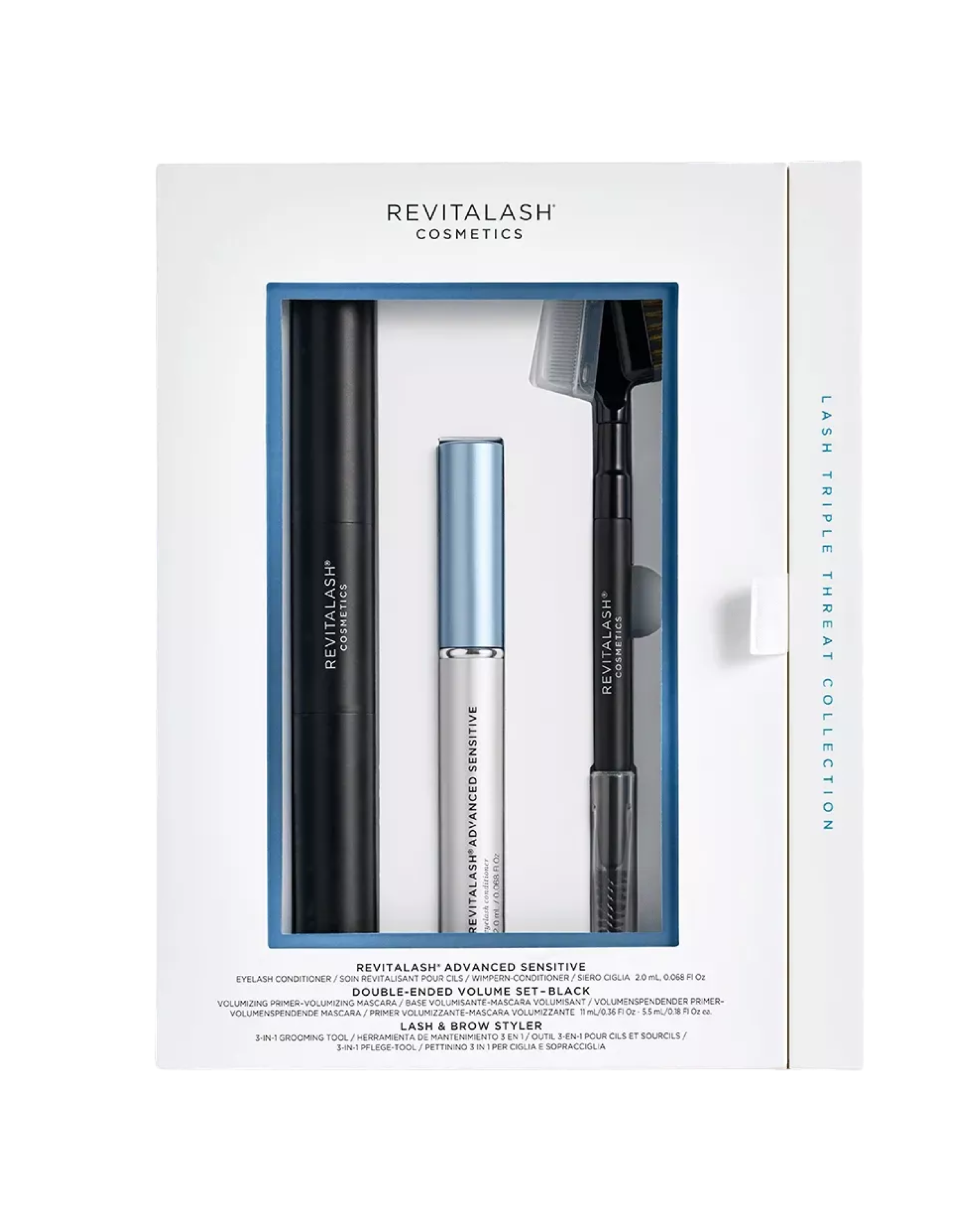 Набір для вій REVITALASH включає найкращі засоби для вій: повнорозмірну сироватку для чутливих очей Revitalash® Advanced Sensitive, туш з праймером для об’єму Double Ended Volume Set, а також новий стайлер для вій та брів.