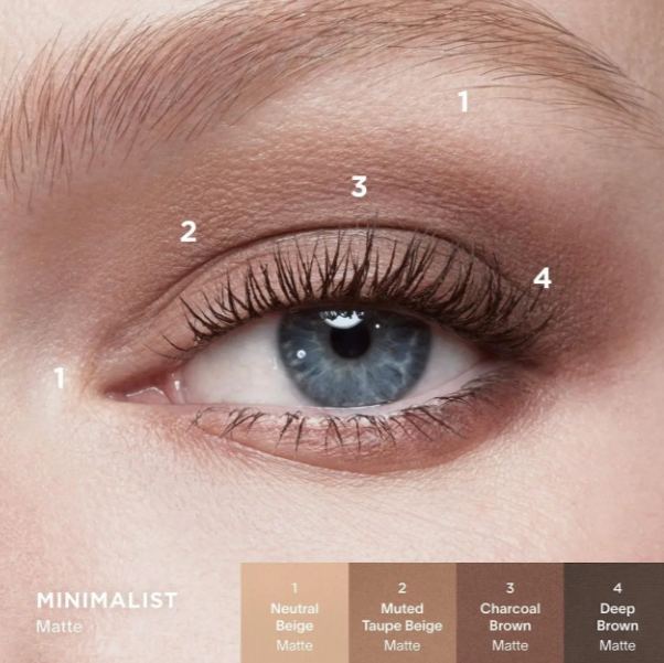 Палітра тіней як мистецтво в мінімалістичному стилі, чотири універсальні відтінки з матовим фінішем кожен з яких можна використати як соло так і в тандемі з іншими, створюючи багатовимірні образи від делікатних до виразних.