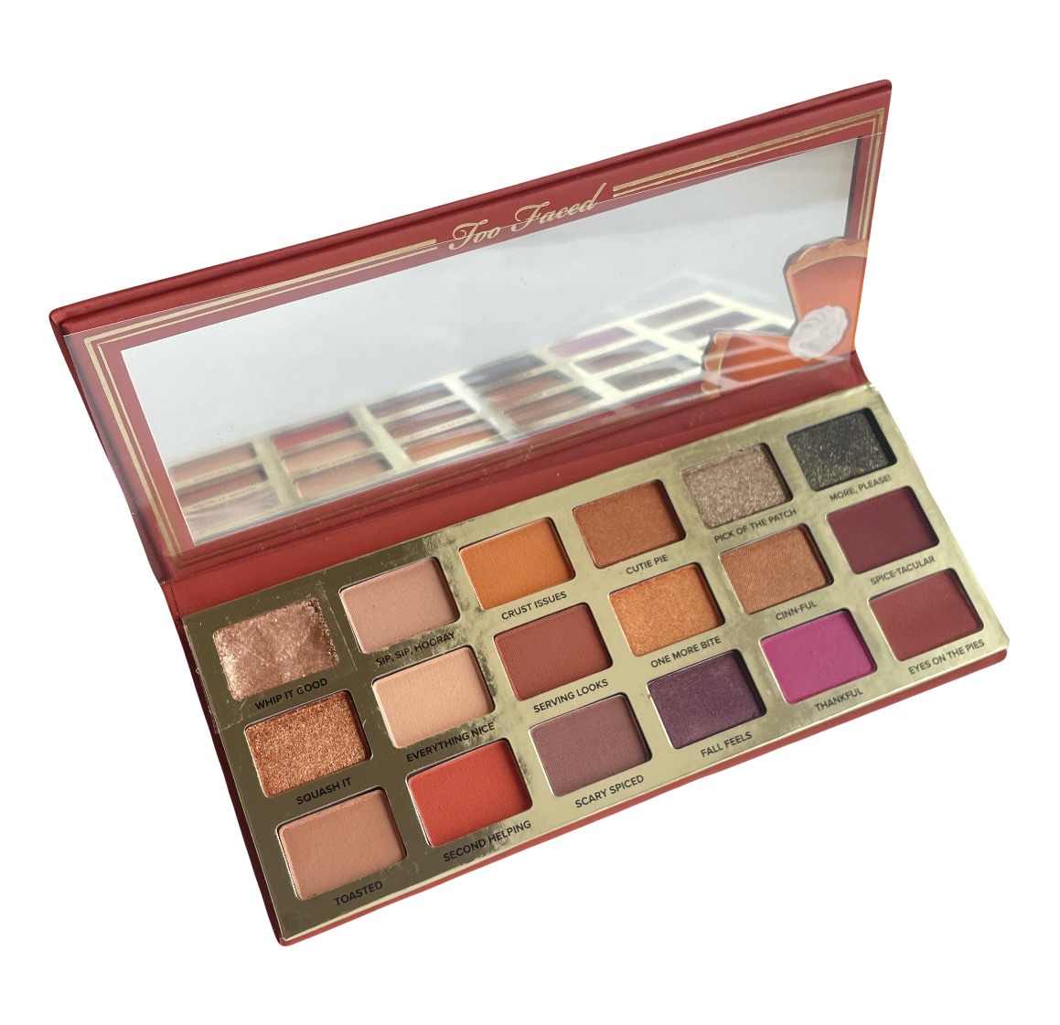 Палітра TOO FACED Pumpkin Spice Second Slice – це красива палітра в осінніх відтінках, з якою вам точно не буде сумно. Нею можна робити різні види макіяжу і таке ефектне, але в той же час ніжне поєднання кольорів точно стане вам у нагоді. Відтінки: Whip It Good Sip, Sip, Hooray Crust Issues Cutie Pie Pick Of The Patch More, Please! Squash it Everything Nice Serving Looks One More Bite Cinn-full Spice-tacular Toasted Second Helping Scary Spiced Fall Feels Thankful Eyes On The Pies