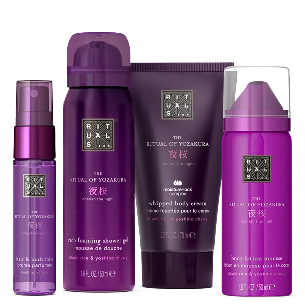 - Пінистий гель для душу The Ritual of Yozakura (50мл): Aqua/Water, Sodium Laureth Sulfate, Decyl Glucoside, Butane, Glycerin, Parfum/Fragrance, Isopropyl Palmitate, Oryza Sativa (Rice) Extract, Prunus Yedoensis Leaf Extract, PEG-40 Hydrogenated Castor Oil, Hydroxyethylcellulose, Sorbitol, Citric Acid, Sodium Benzoate, Propane, Linalool, Isobutane, Benzyl Salicylate, Hexyl Cinnamal, Coumarin, Sodium Hydroxide, Butylene Glycol, Lactic Acid, Potassium Sorbate.