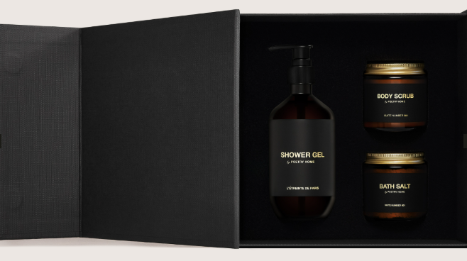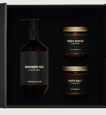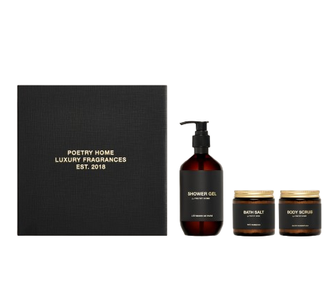 Подарункові набори Poetry Home поєднюють ритуал догляду за тілом, який з кожною краплиною гелю для душу та з кожним нанесенням скрабу для тіла занурює у світ пахощів. Їхні формули доглядають за шкірою, а витончені композиції дарують насолоду. Засоби упаковані в елегантний чорний бокс, прикрашений золотим тисненням, що буде доречний до будь-яких випадків. Аромат засобів з набору – Le vent de la cote dazur. Це свіжий, трав’яний, фруктовий запах. Основні ноти це інжир, свіжоскошена трава, суцвіття чорної смородини, тропічний ліс. Піраміда аромату: Верхні ноти: атласький кедр , інжир , свіжоскошена трава. Ноти серця: суцвіття чорної смородини, тропічний ліс. Базові ноти: листя інжиру , платан західний , смола бальзамічної ялиці. Набір містить: Гель для душу з ніжними та зволожувальними властивостями, який м’яко й делікатно очищує шкіру, перетворюючи звичні водні процедури на задоволення. А після розкішного душу або ванни на шкірі залишається елегантний шлейф аромату Opulence Rouge. Він захоплює неперевершеним поєднанням ванілі, сірої амбри, мускусу, бергамоту, ванільного порошку. Гель не створює відчуття сухості і протягом всього дня підтримує оптимальний рівень зволоженості. Об’єм гелю: 300 мл. 2 Парфумований скраб для тіла з ідеальною текстурою містить сіль Мертвого моря, рисову крихту та пудру кісточок абрикоса, які забезпечують оптимальну й делікатну ексфоліацію. Збагачений екстрактом молока, що насичує шкіру вітамінами A, B, E, D, кальцієм, калієм та іншими мікроелементами, які забезпечують глибоке зволоження і живлення. Після змивання шкіра стає сяючою, гладенькою та оксамитовою, як після SPA-процедури. Підходить для всіх типів шкіри. Об’єм скрабу: 150 гр. 3 Парфумована сіль для ванн створена для домашніх та професійних SPA-процедур. Морська сіль сприяє розслабленню мʼязів та нервової системи. Мінеральні ванни позитивно впливають на стан шкіри, тонізують та покращують її еластичність. Натуральна парфумована олія в складі залишає тривалий приємний аромат на шкірі. Об’єм солі: 150 гр.
