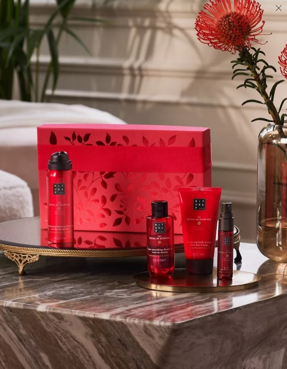 The Ritual of Ayurveda Foaming Shower Gel: Aqua/Water, Sodium Laureth Sulfate, Cocamidopropyl Betaine, Isopentane, Sorbitol, Isopropyl Palmitate, Parfum/Fragrance, Isobutane, PEG-120 Methyl Glucose Dioleate, Glycerin, Sodium Benzoate, Citric Acid, PEG-40 Hydrogenated Castor Oil, Guar Hydroxypropyltrimonium Chloride, Prunus Amygdalus Dulcis (Sweet Almond) Oil, Rosa Damascena Flower Extract, Sodium Sulfate, Linalool, Hexyl Cinnamal, Benzyl Salicylate, Citronellol, Alpha-Isomethyl Ionone, Limonene. The Ritual of Ayurveda Body Cream: Aqua/Water, Cetearyl Alcohol, Glycerin, Caprylic/Capric Triglyceride, Propylheptyl Caprylate, Helianthus Annuus (Sunflower) Seed Oil, Undecane, Parfum/Fragrance, Tocopheryl Acetate, Rosa Damascena Flower Extract, Prunus Amygdalus Dulcis (Sweet Almond) Oil, Tridecane, Tocopherol, Ubiquinone, Allantoin, Carbomer, Sodium Hydroxide, Disodium EDTA, Benzyl Alcohol, Linalool, Hexyl Cinnamal, Benzyl Salicylate, Citronellol, Alpha-Isomethyl Ionone, Limonene, Geraniol, Cinnamyl Alcohol, Citral, Phenoxyethanol, Ethylhexylglycerin. The Ritual of Ayurveda Shower Oil: Glycine Soja Oil, Laureth-4, MIPA-Laureth Sulfate, Ricinus Communis Seed Oil, Parfum/Fragrance, Propylene Glycol, Coco-Glucoside, Glyceryl Oleate, Rosa Damascena Flower Extract, Prunus Amygdalus Dulcis Oil, Tocopherol, Hydrogenated Palm Glycerides Citrate, Lecithin, Ascorbyl Palmitate, Linalool, Hexyl Cinnamal, Benzyl Salicylate, Citronellol, Alpha-Isomethyl Ionone, Limonene. The Ritual of Ayurveda Hair & Body Mist: Aqua/Water, PEG-40 Hydrogenated Castor Oil, Parfum/Fragrance, Propylene Glycol, Phenoxyethanol, Caprylyl Glycol, Linalool, Hexyl Cinnamal, Benzyl Salicylate, Citronellol, Prunus Amygdalus Dulcis (Sweet Almond) Oil, Rosa Damascena Flower Extract, Alpha-Isomethyl Ionone, Limonene, Citric Acid, Geraniol, Citral.
