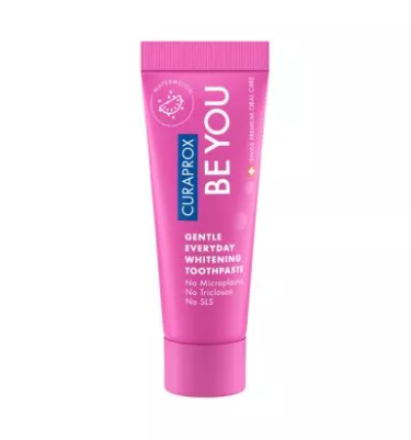 CURAPROX be you pink – це зубна паста, яка надає м’яке відбілювання зубів з ноткою свіжості та сміливими смаками. Зубна паста має м’який і природний відбілюючий ензимний ефект, а також силу ментолових перлин, для довготривалого відчуття свіжості. Pink – це прекрасний солодкий кавун з освіжаючим ментолом. Зубна паста представлена в об’ємі 10 ml. Ензиматичне відбілення від ‘Be you’, і як це працює: Ензимна глюкозооксидоза перетворює цукор у перекис водню і врешті-решт у кисень. Це відбілювання знебарвлює потемніння на емалі на зубах та водночас стимулює власну лактопероксидазну систему організму, що підтримує здорову флору у ротовій порожнині. Плюс оптичне відбілення PrestigeSparklingBlue відбиває синє світло. Близька людина відразу ж візуально помітить білизну зубів. Гідроксилапатит ремінералізує і вирівнює зубну емаль, а це зменшує появу карієсу. Характеристика засобу: Сила перлин: велика кількість ментолу для надзвичайно тривалого відчуття свіжості та для особливо м’якого чищення. Зубна паста: фтори (моно фтор фосфат натрію). Гідроксиапатит, глюкозооксидоза, ксилітом. Екстракти трав: ехінацеї (Ехінацея пурпурна), гіркий апельсин (померанець), жовтець польовий (гарпагофітум). Індійський щитолисник (центела азіатська) Вітаміни: провітамін B5 (пантенол) Не містить SLS, триклозану, синтетичних мікрочасточок RDA біля 50