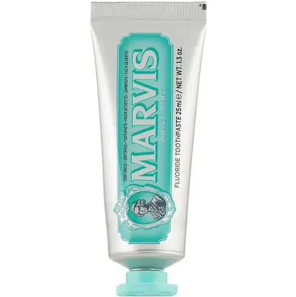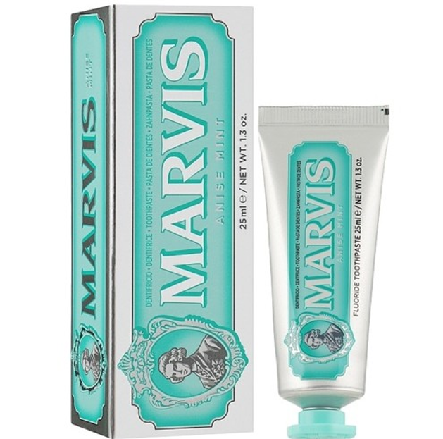 Marvis Classic Anise Mint – це зубна паста з насиченою кремовою текстурою, яка поєднує в собі теплий та пряний аромат анісу і охолоджуючий смак м’яти. Вона ефективно очищає зуби і освіжає подих, залишаючи у вас відчуття легкого поколювання! Формула фтору допомагає боротися з зубним каменем і зубним нальотом, підтримує дихання свіжим і запобігає руйнуванню зубів. Зубна паста представлена в об’ємі 25 ml.