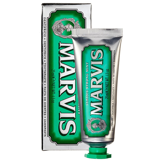MARVIS Classic Strong Mint – це зубна паста від італійського бренду для щоденного використання. Делікатно усуває наліт, не пошкоджує емаль. Створює об‘ємну піну, яка легко видаляє всі забруднення. Фтор в складі укріплює зубну емаль, а ксиліт запобігає розвитку патогенної мікрофлори та неприємного запаху. В комплексі ці два компоненти надійно захищають зуби від утворення карієсу. Має яскравий освіжаючий м’ятний смак. Алюмінієва туба у вінтажному стилі дуже зручна в користуванні. Зубна паста представлена в об’ємі 25 ml.