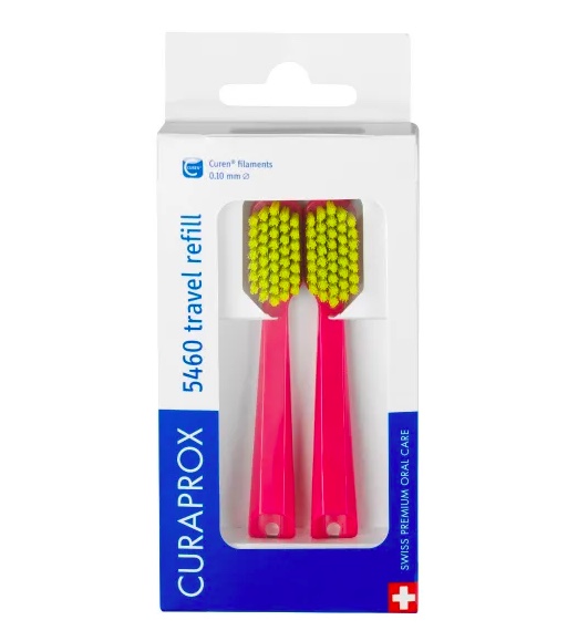 CURAPROX travel refill – це набір з двох змінних (запасних) насадок щітки 5460 Ultra Soft для дорожнього набору. Це практичне рішення для дорожньої зубної щітки CS 5460, адже Ви отримуєте дві нові насадки для щітки, які можна прикріпити до ручки. Вміст набору: Дві насадки для зубної щітки CS 5460 для подорожей. Зубна щітка CURAPROX 5460 Ultra Soft підходить для делікатного дбайливого, проте ефективного очищення зубів, без шкоди для ясен. Щетинки Curen® – найкращі, коли мова заходить про захист від карієсу та переондотиту. М’якість – Ultra Soft Кількість щетинок – 5460 Колір – жовтий На зубній щітці CS 5460 Ultra Soft розміщується 5460 щетинок діаметром 0,1 мм із заокругленими кінчиками. Тонкі щетинки надають зубній щітці неймовірну м`якість, а самі щетинки розміщені з високою щільністю розташування. Вони утворюють ідеально рівну робочу поверхню, яка максимально щільно контактує з поверхнею зубів. В результаті ми отримуємо неперевершену чистячу поверхню, розміщену на ультракомпактній голівці, яка дає змогу очистити кожен куточок ротової порожнини. Більш того, щетина не виготовлена з нейлону, а виготовлена із запатентованого матеріалу Curen®, який робить щітки особливо ефективними. Переваги щітки Curaprox 5460 Ultra Soft: М`якість найкращих щетинок Curen®; Результативність: висока щільність розташування щетинок Curen®; Дістає до кожного важкодоступного місця та міжзубних проміжків, компактна та має маленьку голівку; Чистить під правильним кутом, має восьмигранну ручку. Не містить шкідливих речовин, таких як бісфенол А (BPA), фталати або азобарвники.