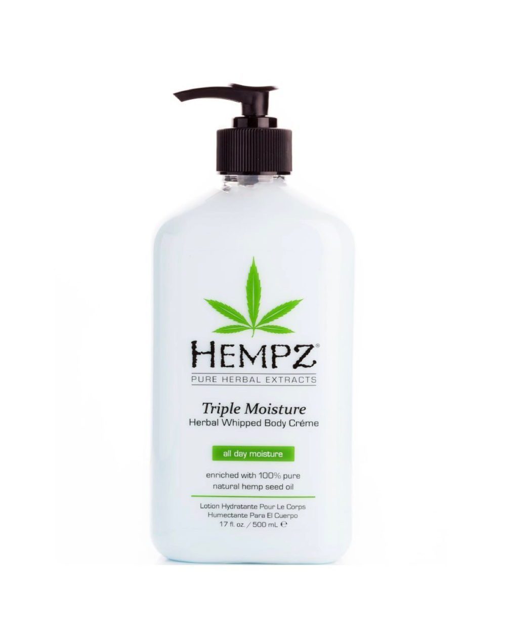 Hіжний зволожуючий крем для тіла потрійної дії Triple Moisture Herbal Whipped Body Creme збагачений 100% очищеним натуральним маслом конопляного насіння та запатентованим комплексом для інтенсивного зволоження Triple Moisture Complex, у складі якого зволожуюча олія янгу, екстракт яблука та заспокійливий екстракт імператриці циліндричної. Ніжний крем для тіла потрійної дії інтенсивно зволожить шкіру тіла протягом 24 годин, пом’якшуючи суху і огрубілу шкіру.