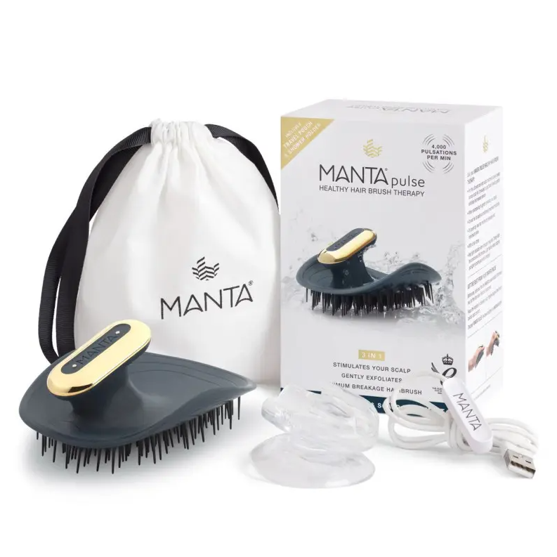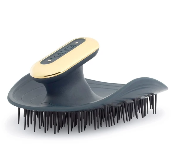 MANTA Pulse Brush Deep – це масажна щітка для шкіри голови та волосся, магнітні пульсації якої вібрують через кожну її щетину. Масаж під час миття голови забезпечує більш ретельне очищення і знімає напругу. М’яке відлущування видаляє залишки продукту і ороговілі клітинки шкіри голови, не драпаючи та не подразнюючи шкіру. Натисніть один раз для зняття стресу та напруги (2000 пульсацій на хвилину), двічі для активізації кровотоку та збільшення циркуляції крові (4000 пульсацій на хвилину). Щітка MANTA Pulse Brush Deep представлена в темно-синьому кольорі. Щітка надзвичайно м’яка, мінімізує ламкість та надає блиск. Підходить для всіх типів волосся, включно з тонким, густим, кучерявим, дитячим, чоловічим та власникам нарощеного волосся. Щітка першочергово створена для мокрого волосся, для миттєвого ковзання по волоссю за допомогою силіконового матеріалу, який не має грубих країв, що могли б зачіпати, смикати або рвати волосся. Запатентована компанією Pioneer технологія FLEXGUARD™ на силіконовій основі дозволяє кожній щетинці здійснювати повний рух на 360 градусів, що м’яко розплутує вузлики та зменшує натяг волосся, зводячи до мінімуму його ламкість та пошкодження. Це перша щітка, яка набуває форми долоні та шкіри голови, щоб швидко й акуратно розплутувати волосся без болю. Масаж ніжно стимулює та відлущує шкіру голови, сприяючи росту здорового волосся, а також допомагає розслабитися. Підходить для використання на вологому волоссі та для сушіння волосся феном, адже щітка є термостійкою (до 80°C) та антистатичною. Також рекомендується використовувати щітку під час миття волосся для рівномірного та економного розподілу шампуню, кондиціонера та інших засобів догляду. Переваги MANTA pulse brush deep: Тримач для душу в комплекті. Підходить для всіх типів волосся, в тому числі для нарощеного. Надзвичайно м’яка: мінімізує ламкість та надає блиск. Набуває форми долоні та шкіри голови, щоб швидко й акуратно розплутувати волосся. Підходить для використання як на вологому, так і на сухому волоссі. Стимулює кровообіг та ріст волосся. Знімає стрес і напруження.