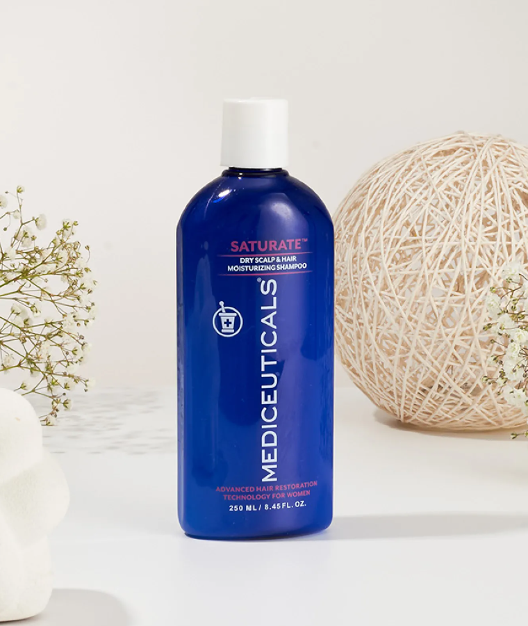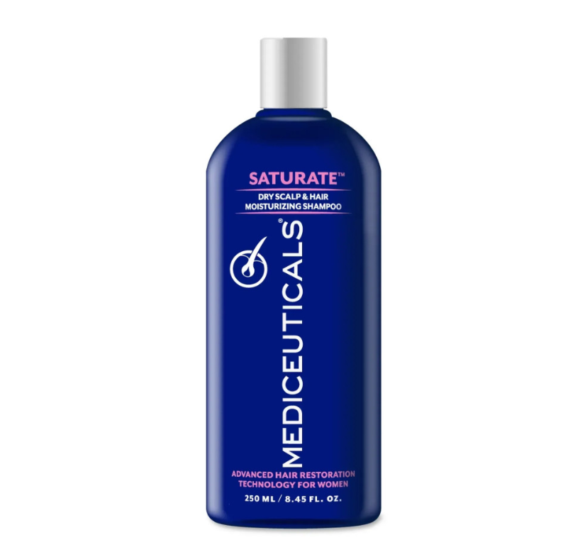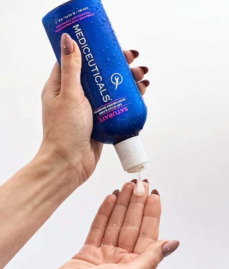 MEDICEUTICALS saturate shampoo – це зволожуючий шампунь проти випадіння та стоншення волосся у жінок. Шампунь створений для сухого волосся та шкіри голови. Надає об’єму і щільності тонкому, ослабленому волоссю без обтяження. Ключові інгредієнти: PureZeroTM – формула без SLS (лаурилсульфат натрію) ніжно очищає волосся та шкіру голови, не пересушуючи їх і не порушуючи гідроліпідний бар’єр. Підходить для всіх типів волосся. TriaminocoptinolTM – сприяє зниженню надмірного випадіння волосся і стимулює ріст нового. Впливає на три основні причини випадіння волосся: фермент 5-альфа-редуктазу (бере участь в утворенні ДГТ), недостатній кровообіг та слабке закріплення волосся у фолікулах. NutraCellTM – стимулює кровообіг шкіри голови для кращого засвоєння корисних речовин. FemmigenTM – очищає та детоксикує шкіру голови від ДГТ. Комплекс, розроблений для жінок будь-якого віку, які страждають від випадіння та стоншення волосся. Color Retention ComplexTM – захищає фарбоване волосся від УФ-випромінювання та вимивання кольору для більш виразного та стійкого результату фарбування. Надає волоссю натурального блиску. Aloe Barbadensis (сік листя алое барбаденсіс) – допомагає пом’якшити та зволожити сухі шкіру голови та волосся.