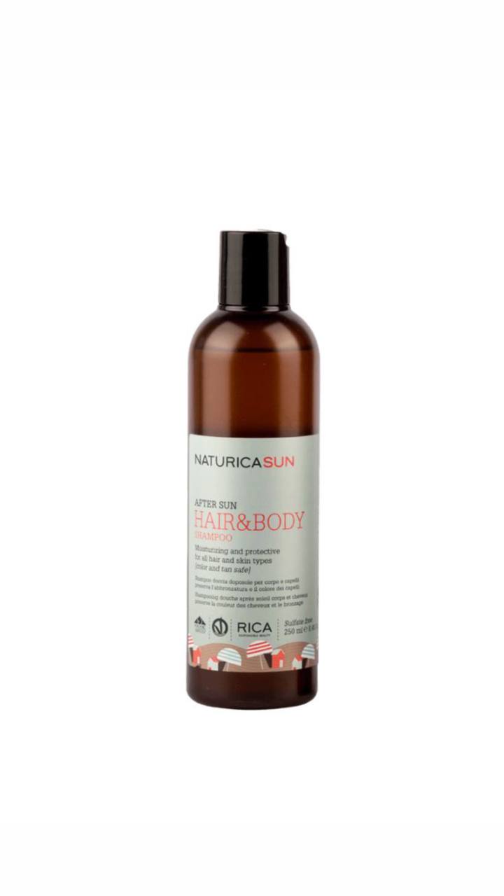Зволожуючий шампунь для волосся після засмаги RICA after sun hair and body shampoo створений для волосся та тіла після перебування на сонці. Засіб м’яко видаляє залишки солі та хлору з волосся та шкіри, він безсульфатний, на основі делікатних амфотерних та неіоногенних ПАР. Після сонячного впливу він відновлює живлення волосся, готуючи його до наступних процедур, водночас освіжаючи шкіру та волосся. Всі рослинні компоненти продукту були вирощені на території Італії. А саме пакування виготовлене з біорозкладних інгредієнтів рослинного походження. Активні компоненти: Glycerin та Glyceryl Oleate – забезпечують ефективне та потужне зволоження. Екстракт лимону – походить з острова Сицилія. Він очищає, освіжає, покращує стан жирної шкіри голови в цілому: нормалізує процеси епітелізації у вивідних протоках сальних залоз та гирлах волосяних фолікулів. Екстракт винограду – зміцнює волосся по довжині, надає йому блиск та еластичність. Гідролізовані пшеничні висівки – забезпечують необхідний заспокійливий ефект та роботу з почервоніннями після перебуванні на сонці, повертають волоссю по довжині здоровий вигляд. Екстракт гороху – зміцнює структуру волосини, утворюючи плівку, яка відмінно утримує вологу, захищає і робить волосся еластичним, запобігає ламкості, потовщує волосся, надає блиску та володіє антистатичними властивостями. Гідролізований екстракт волоського горіха – діє як потужний антиоксидант, здатний зберегти молекулу барвника, перешкоджаючи руйнуванню кольорів під впливом УФ випромінювання.
