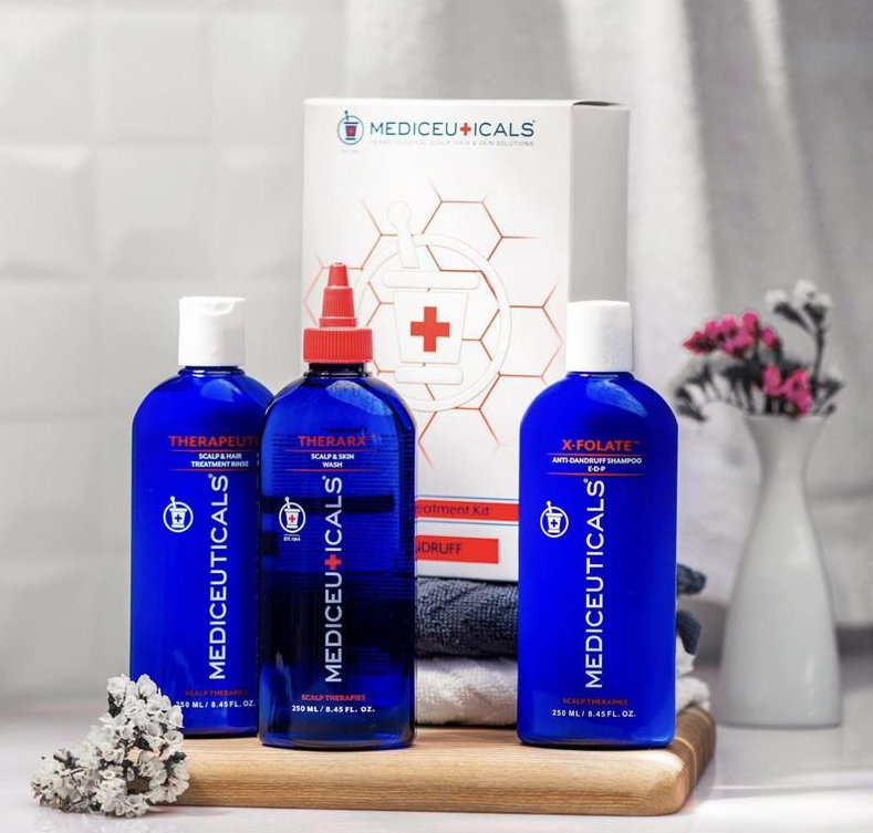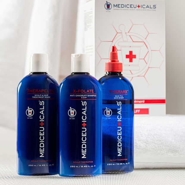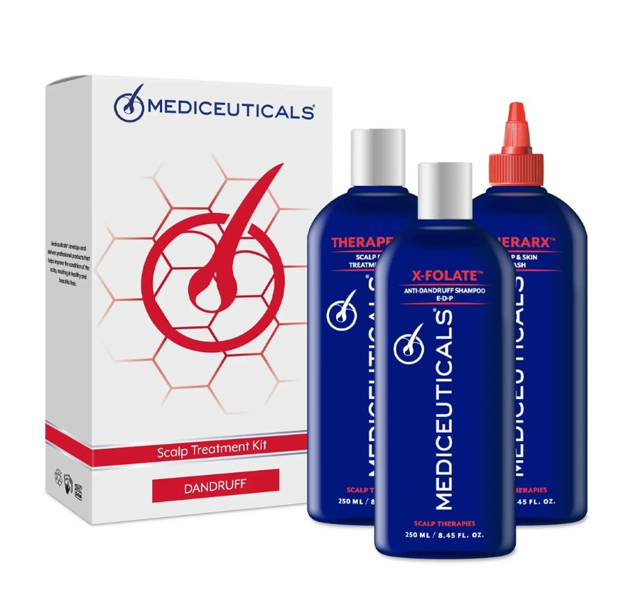 MEDICEUTICALS Scalp Treatment Kit – це набір для волосся спеціально розроблений проти лупи. Набір включає три повнорозмірні продукти для досягнення найкращих результатів у лікуванні себорейного дерматиту. При використанні усіх продуктів набору можемо прогнозувати стійку та тривалу ремісію дерматиту. У набір входить: 1. THERARX – це спеціалізований догляд для лікування скальпу та шкіри. Це лікувальний, очищаючий, протизапальний догляд для шкіри голови та тіла. Він зменшує запалення, вбиває шкідливі мікроорганізми, заспокоює та очищає подразнену/чутливу шкіру голови і тіла. Засіб не сушить шкіру та регулює рН шкіри голови. Продукт можна використовувати при комплексному лікуванні надмірного виділення шкірного себуму, акне, почервоніння, сонячних опіків або укусів комах. Ключовий інгредієнт це Benzalkonium Chloride (бензалконію хлорид), який в основному застосовується як антимікробний агент. Він вбиває мікроорганізми та перешкоджає їх подальшому зростанню. 2. Х-FOLATE – це лікувальний шампунь для вирішення різних проблем шкіри голови: усуває лупу, лущення, запалення та подразнення шкіри голови. Застосовується при лікуванні лупи, псоріазу, екземи та дерматитів. Шампунь заспокоює чутливу, почервонілу та подразнену шкіру, видаляє скупчення ороговілих клітин шкіри голови, контролює подальший поділ і відлущування клітин. Шампунь безпечний для фарбованого волосся та підходить для щоденного лікувального догляду. Ключові інгредієнти це піроктон оламін, який має протигрибкову та антибактеріальну дії, допомагає сповільнити вироблення шкірного сала, яке є однією з основних причин розвитку бактерій і лущення. А також клімбазол, місцевий протигрибковий засіб, який пригнічує розмноження грибів. 3. THERAPEUTIC – це заспокійливий кондиціонер для шкіри голови та волосся. Він пом’якшує та заспокоює скальп та шкіру тіла, м’яко кондиціонує та розплутує волосся. Засіб має невагому формулу без олій та жирів, регулює рН шкіри голови та волосся, може застосовуватися як заспокійливий засіб для зменшення чутливості, сухості та стягнутості шкіри всього тіла. Ключовий інгредієнт це піроктон оламін, який має протигрибкову та антибактеріальну дії, допомагає сповільнити вироблення шкірного себуму, яке є однією з основних причин розвитку бактерій і лущення. Також у складі містить екстракт жовтокореня, натуральний засіб з антибактеріальними, протизапальними, антисептичними, в’яжучими, заспокійливими та загоювальними властивостями. Поетапне використання засобів з набору: Нанесіть THERARX на проблемні ділянки шкіри голови, на сухе волосся. Проведіть ніжний масаж голови. Засіб можна застосовувати 2-3 рази на тиждень. Залиште догляд на 1-2 хвилини для нейтралізації небажаних симптомів. НЕ змивайте. Нанесіть шампунь X-FOLATETM або X-DERMATM, або SOLV-XTM на волосся, проведіть масаж шкіри голови. Залиште на 3 хвилини. Ретельно промийте волосся водою, за необхідності повторіть нанесення шампуню. Промийте волосся та промокніть рушником. Ніжними масажними рухами нанесіть на шкіру голови та волосся кондиціонер THERAPEUTIC, залиште на 2-3 хвилини. Ви відчуєте прохолоду!!! Ретельно промийте голову водою.